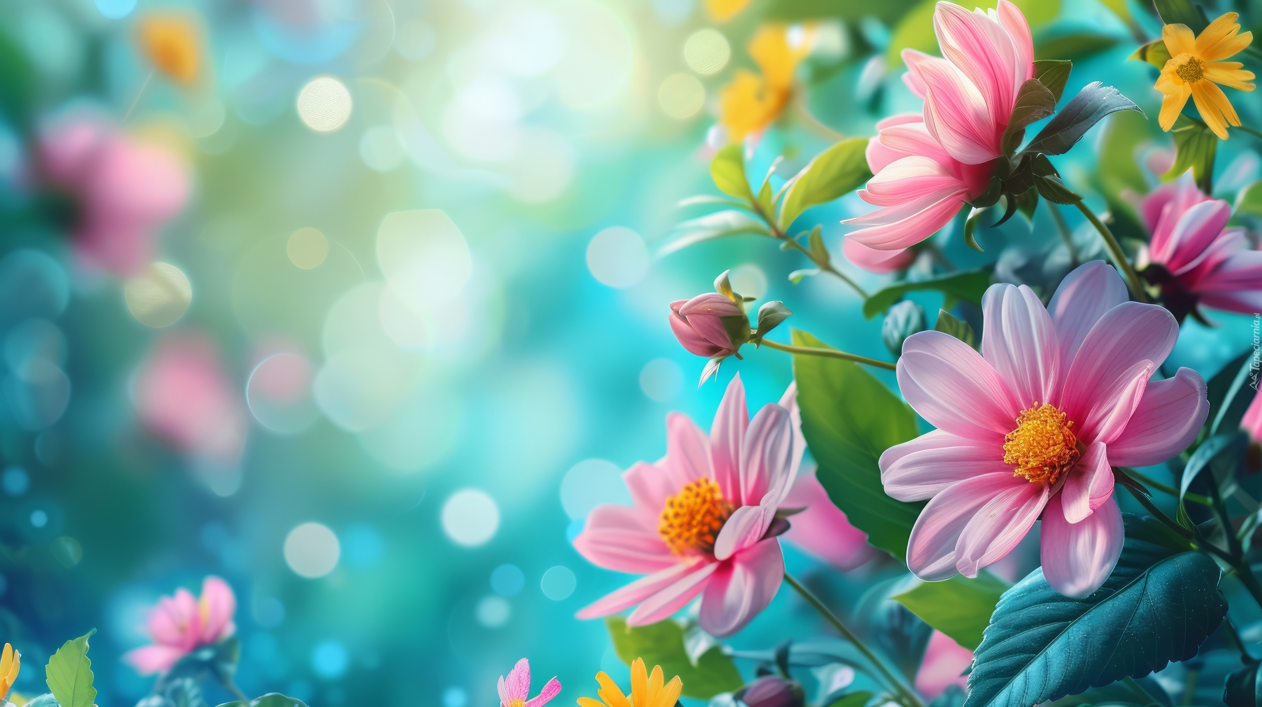 Edytor tapety: Różowe dalie z pąkami na rozświetlonym tle