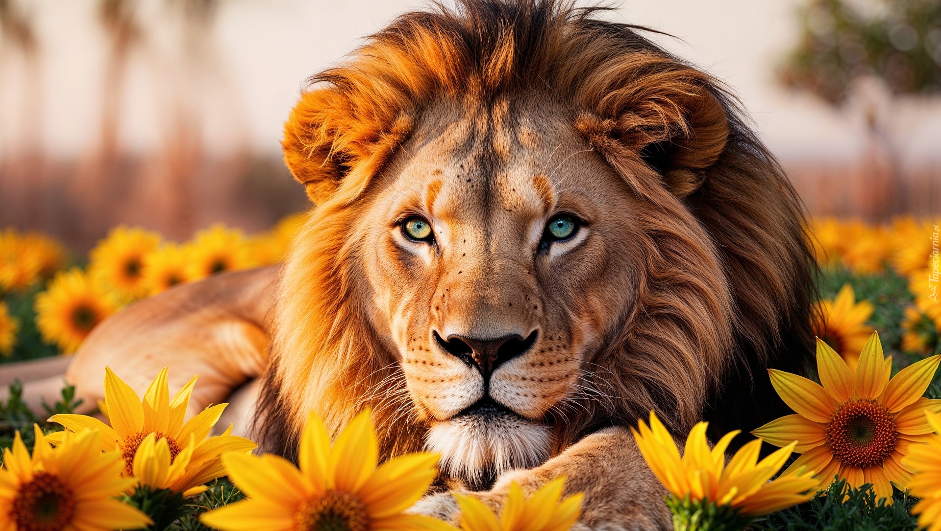 Edytor tapety: Lew leżący na słonecznikach