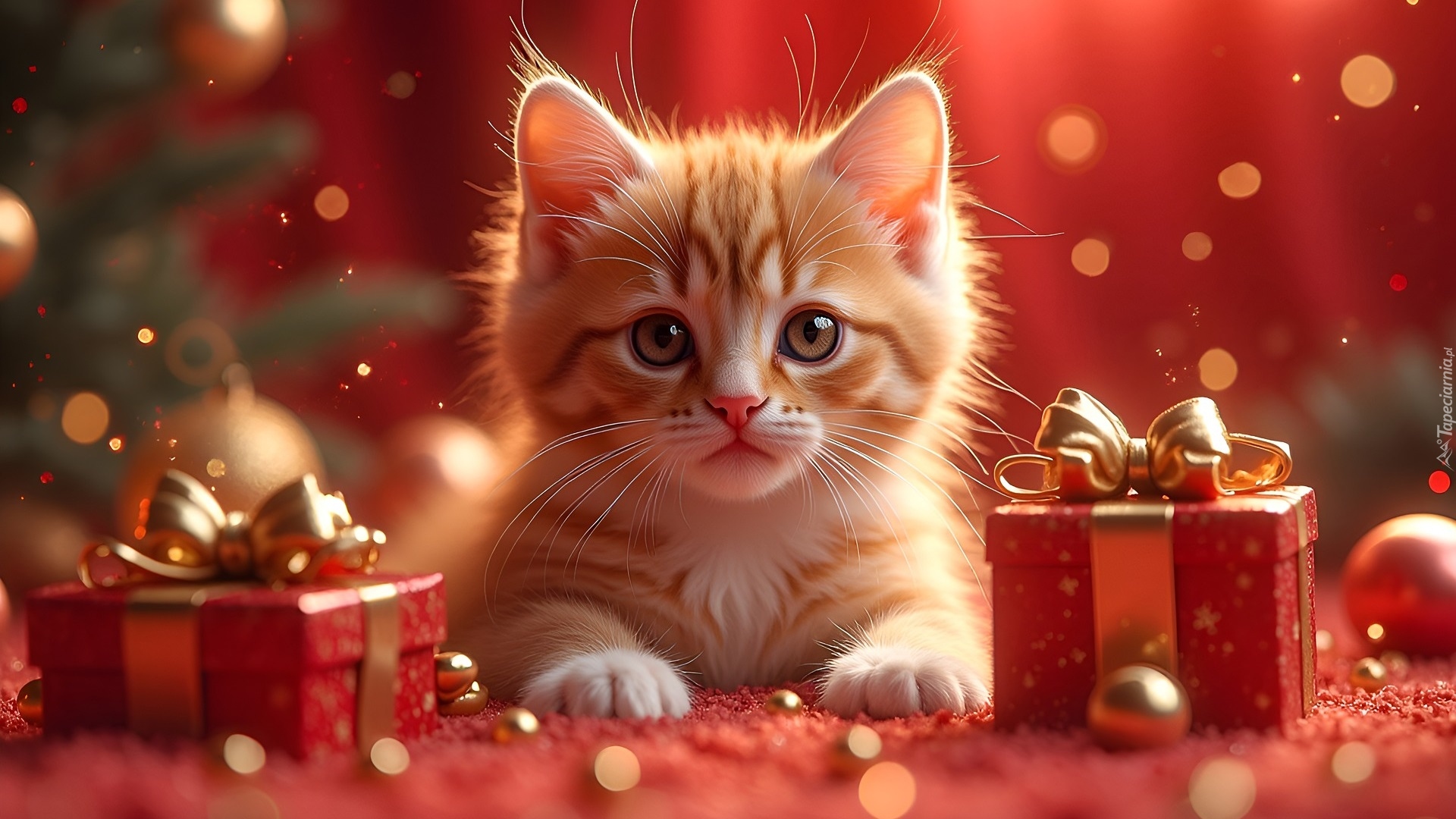 Edytor tapety: Mały rudy kotek między świątecznymi prezentami
