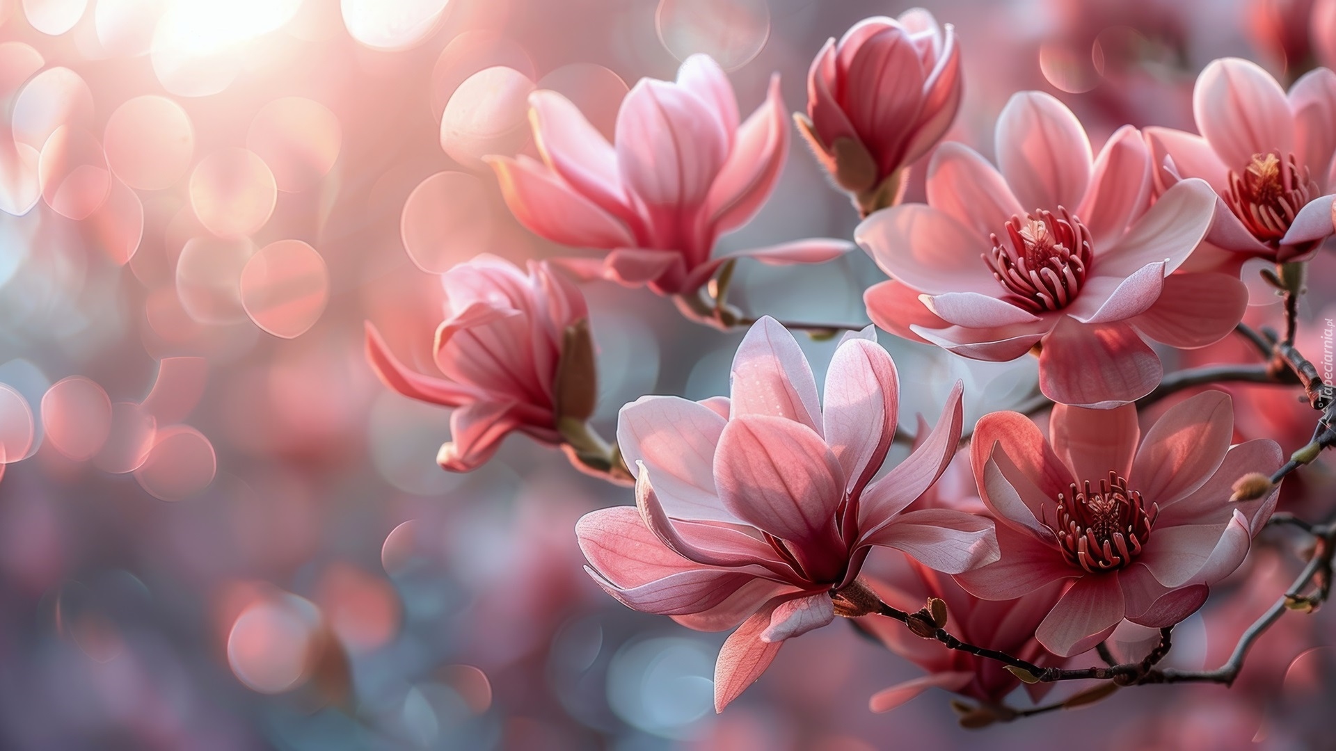 Edytor tapety: Gałązki z rozwiniętymi różowymi kwiatami magnolii