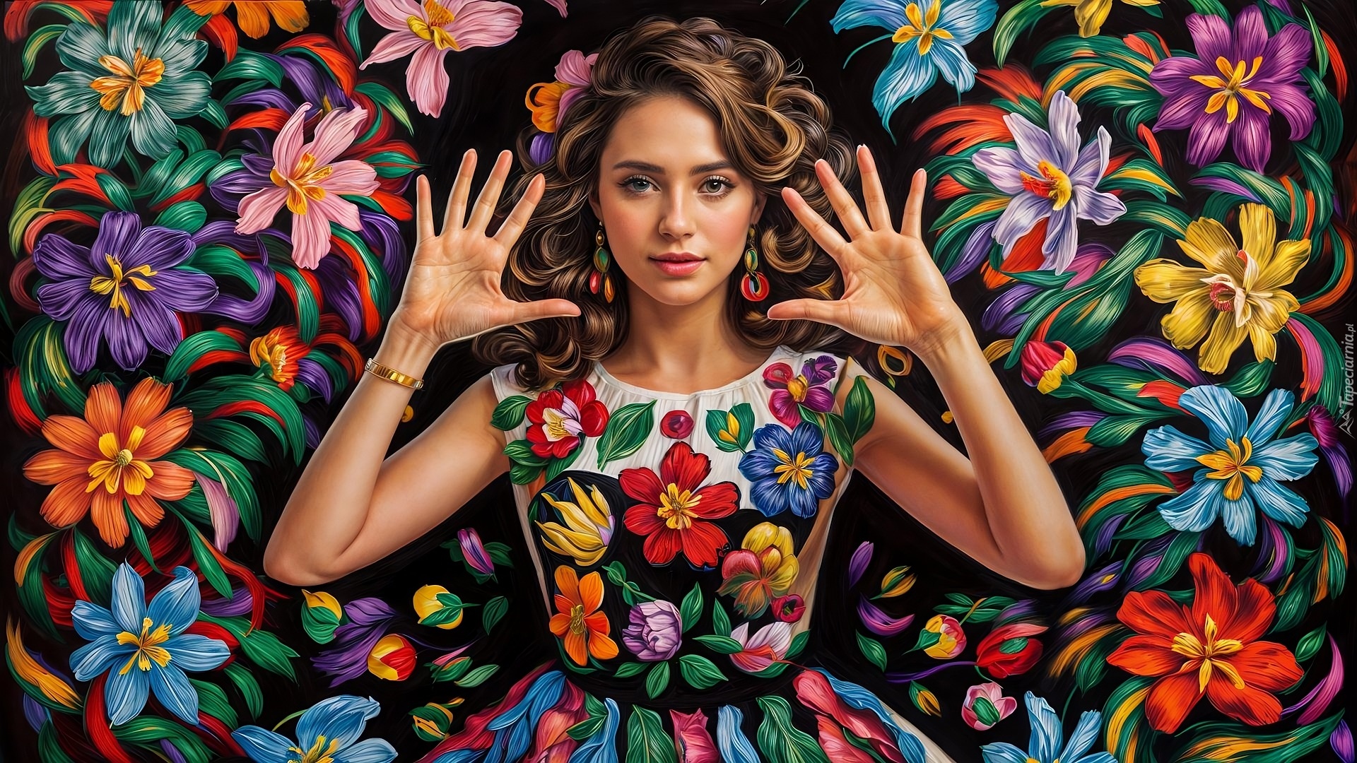 Edytor tapety: Kobieta wśród kolorowych kwiatów w grafice