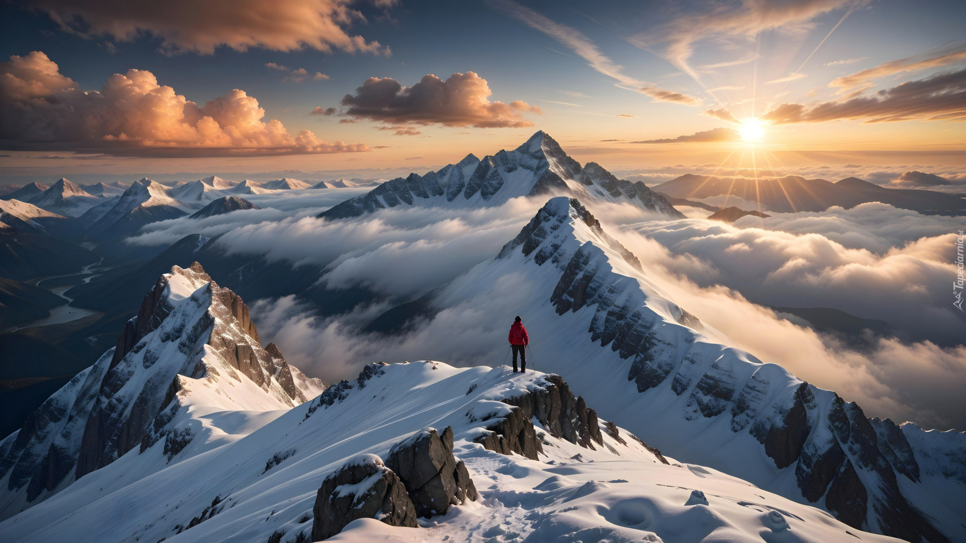 Edytor tapety: Człowiek na ośnieżonym szczycie i mgła nad górami