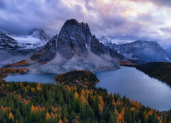 Edytor tapety: Lasy nad jeziorem Magog i Mount Assiniboine pod zachmurzonym niebem