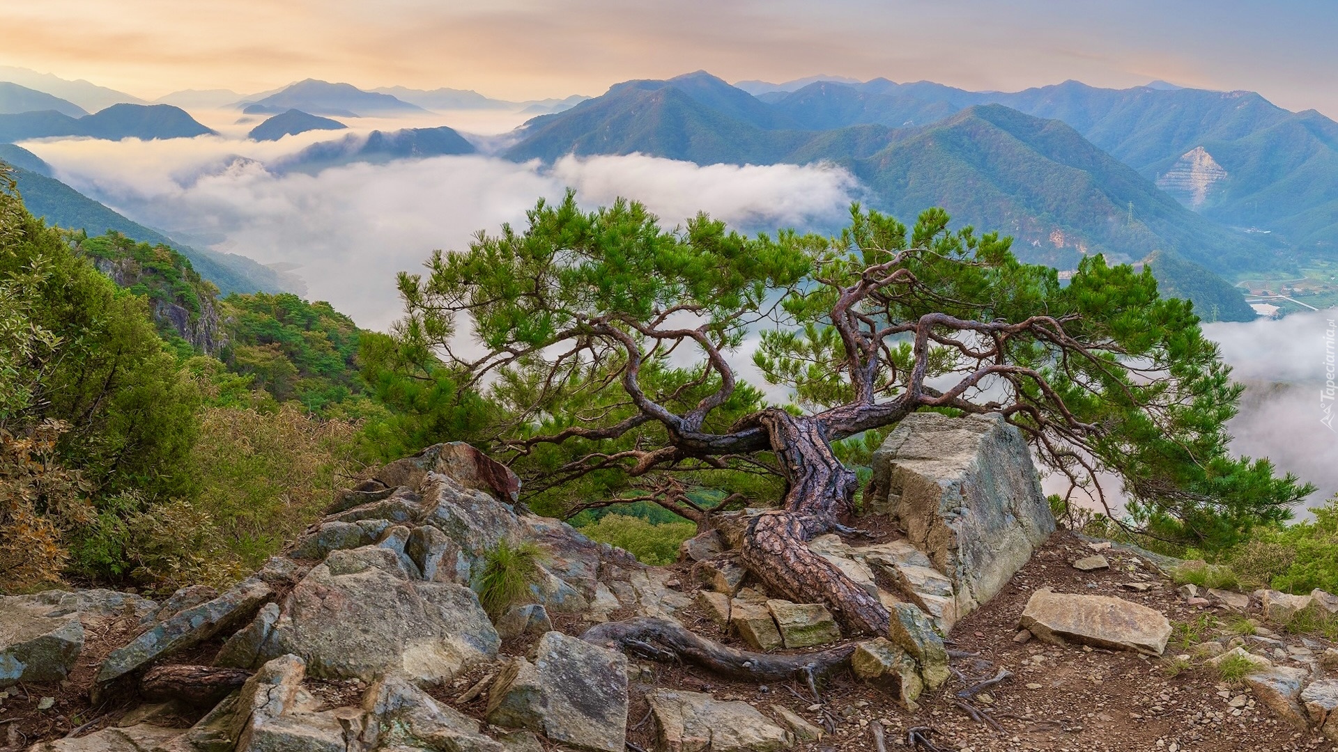 Edytor tapety: Krzywa sosna na skałach i mgła nad górami