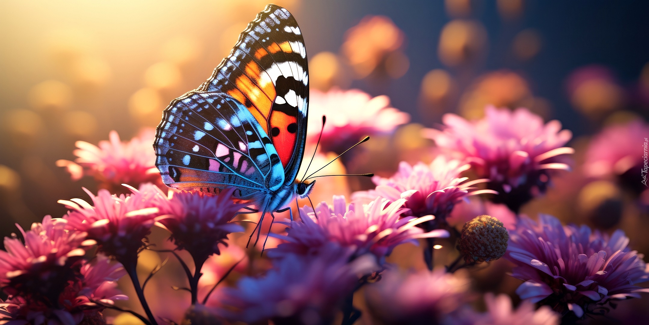 Edytor tapety: Kolorowy motyl na rozświetlonych różowych kwiatach