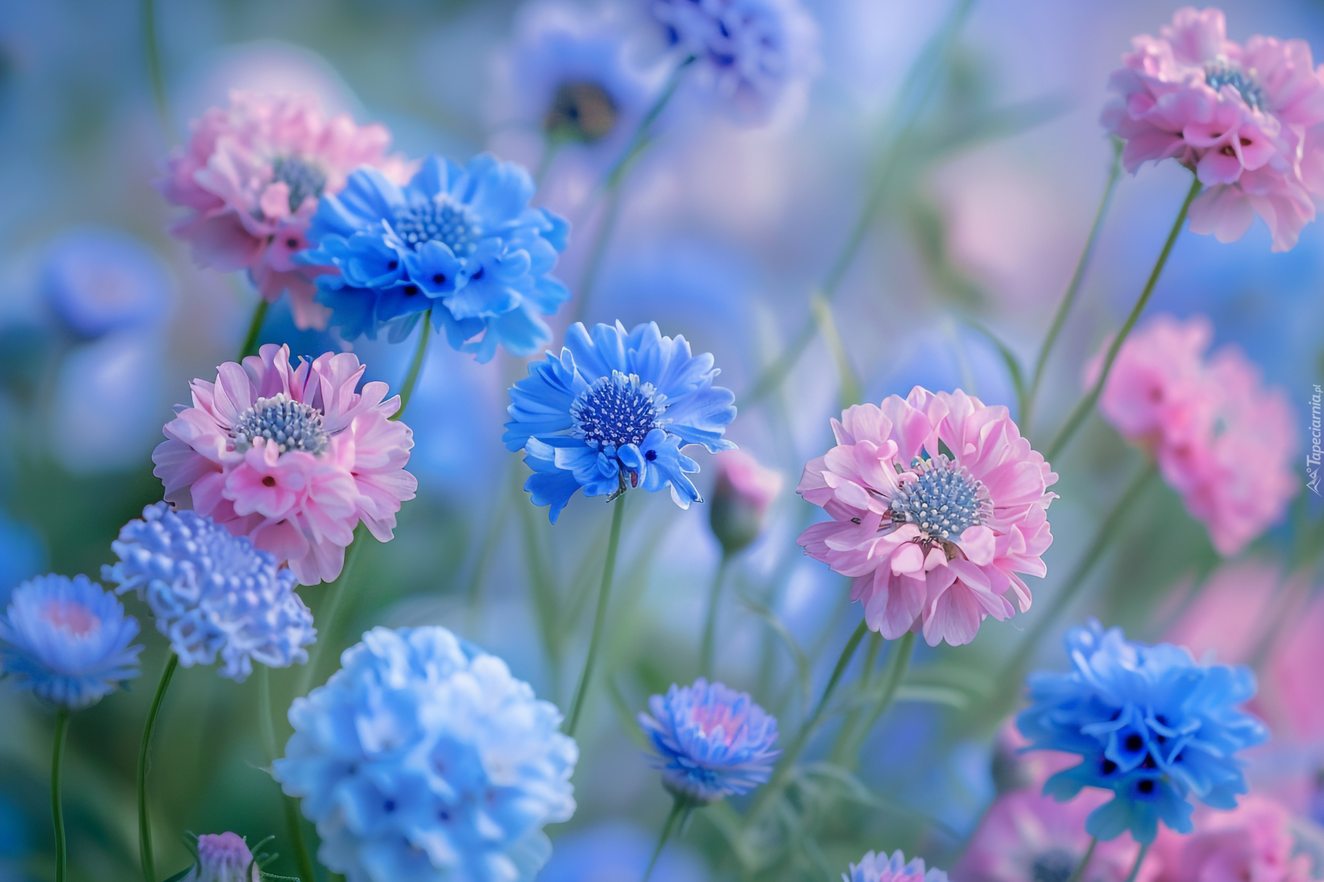 Edytor tapety: Rozkwitnięte niebieskie i różowe kwiaty
