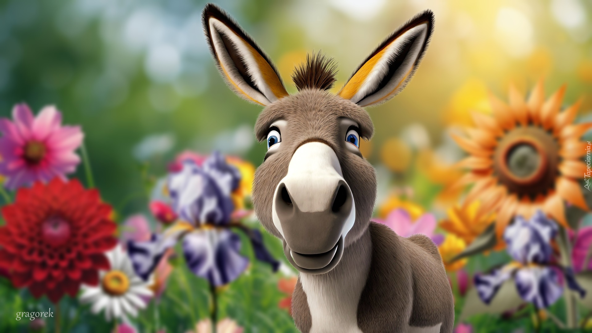 Edytor tapety: Osiołek na tle rozmytych kwiatów w ogrodzie