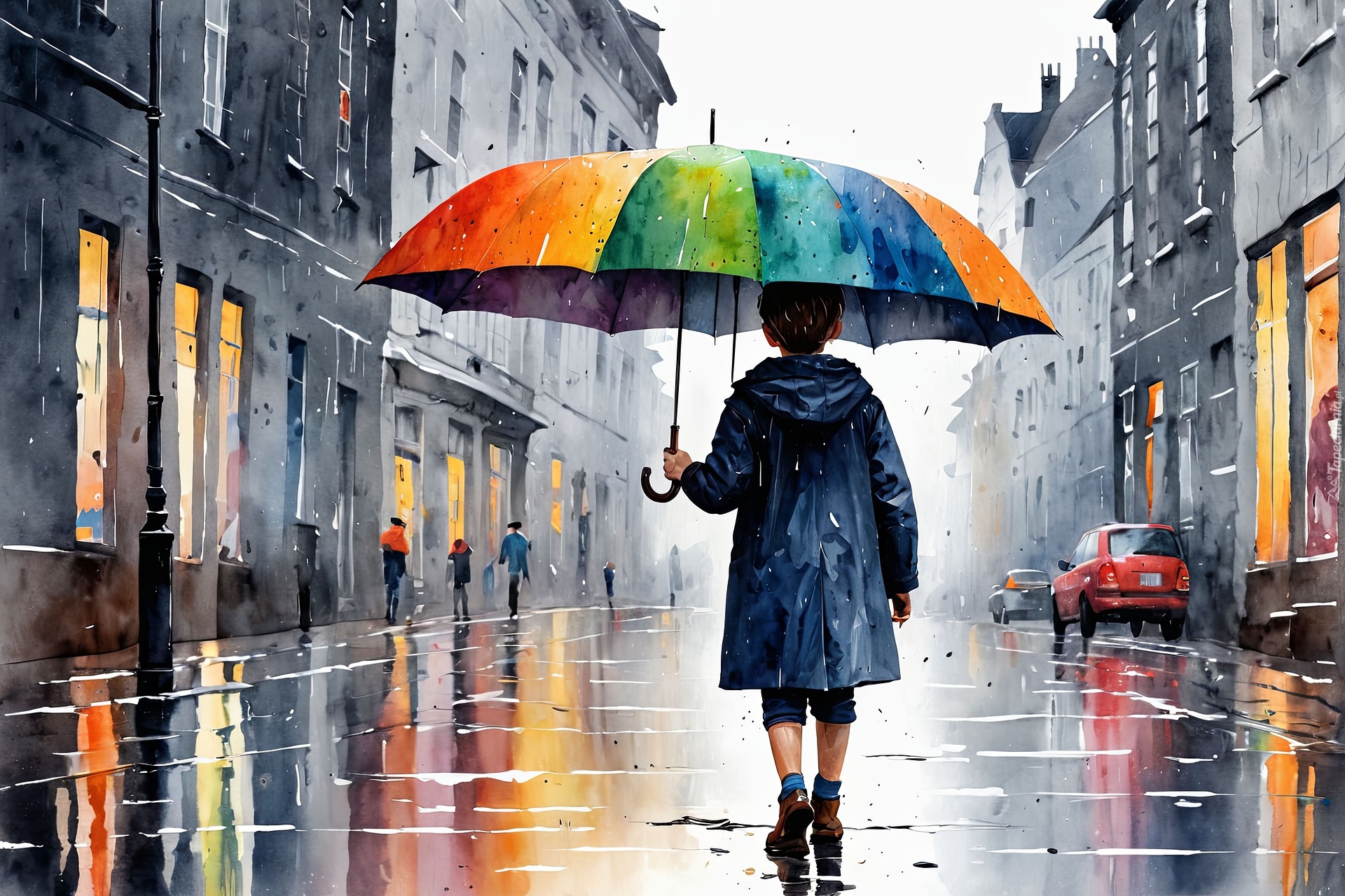 Edytor tapety: Dziecko pod kolorowym parasolem na ulicy