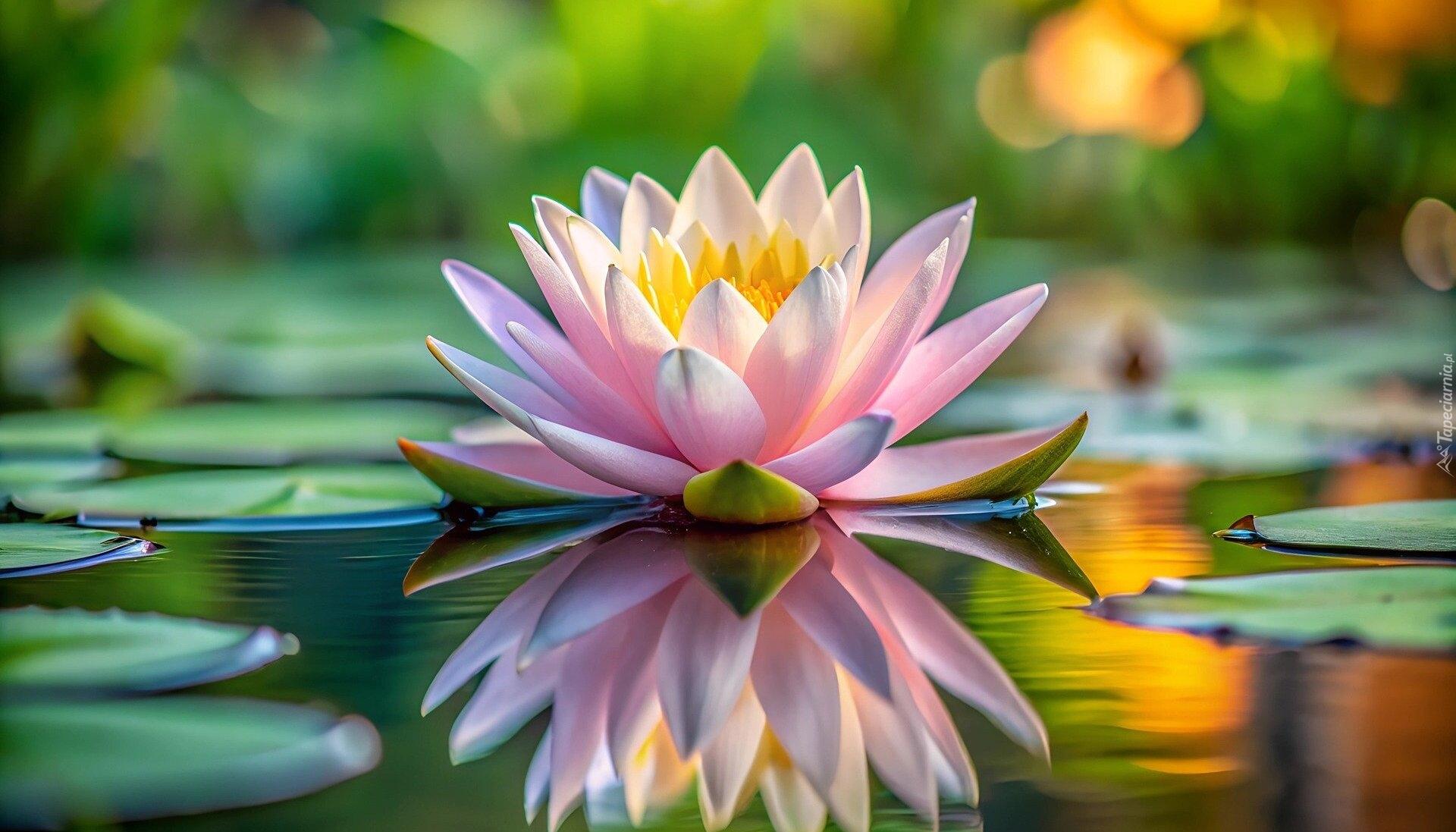 Edytor tapety: Odbicie rozkwitniętej różowej lilii wodnej w stawie