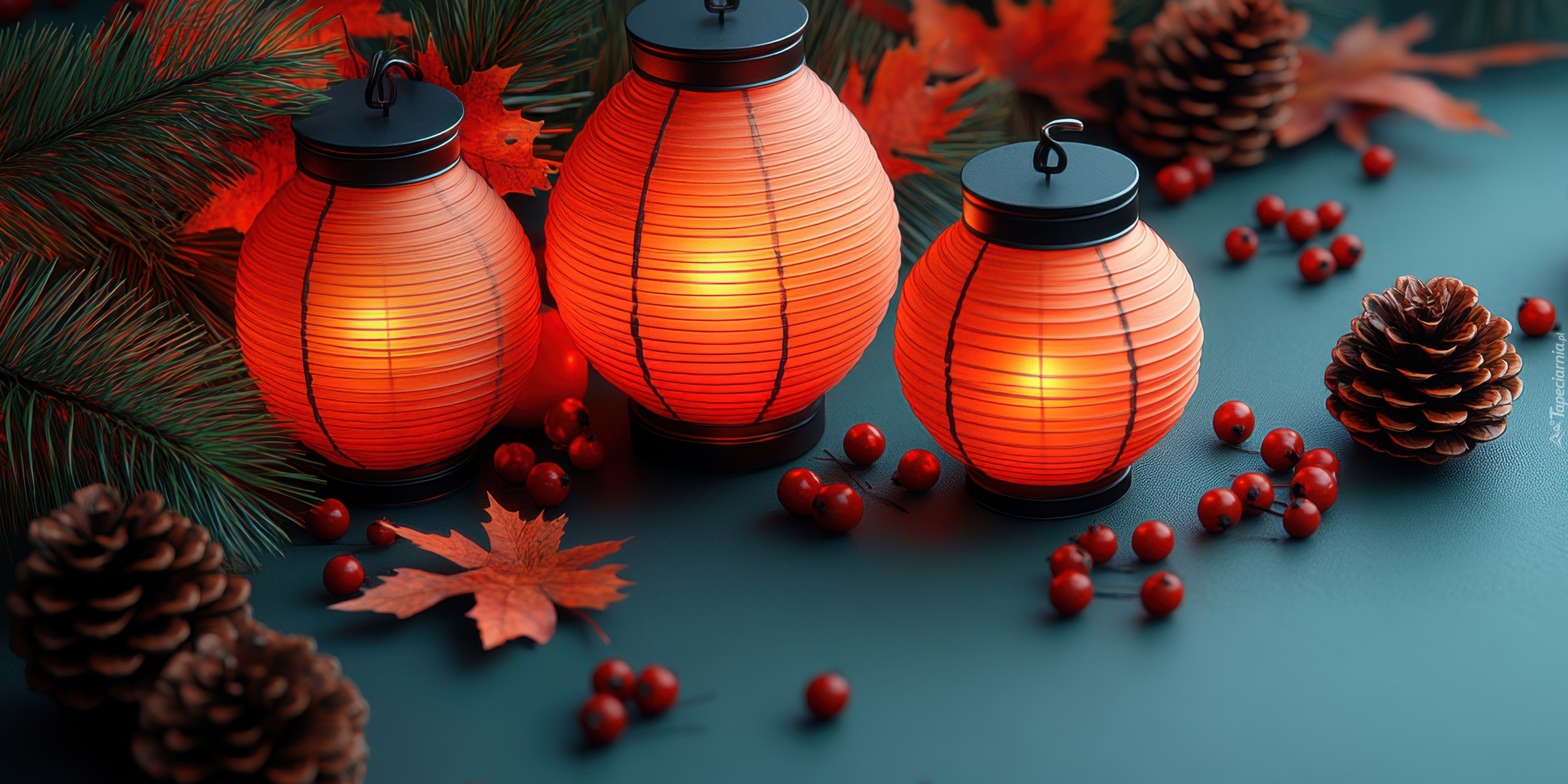Edytor tapety: Płonące lampiony obok szyszek i liści w grafice
