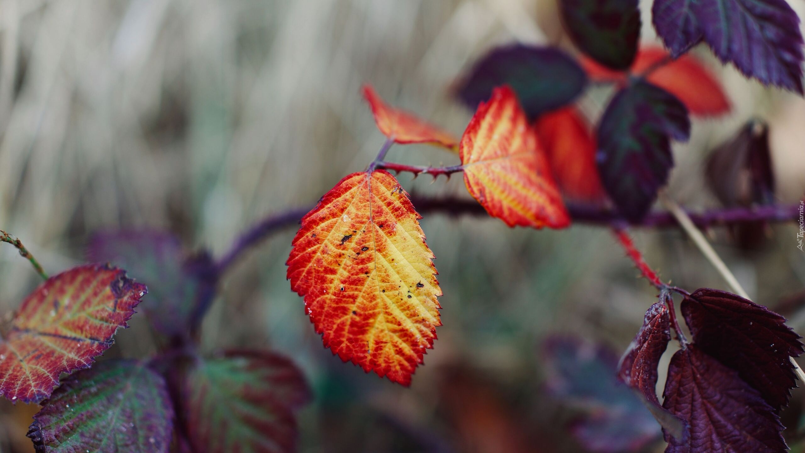Edytor tapety: Gałązka z jesiennymi liśćmi na rozmytym tle