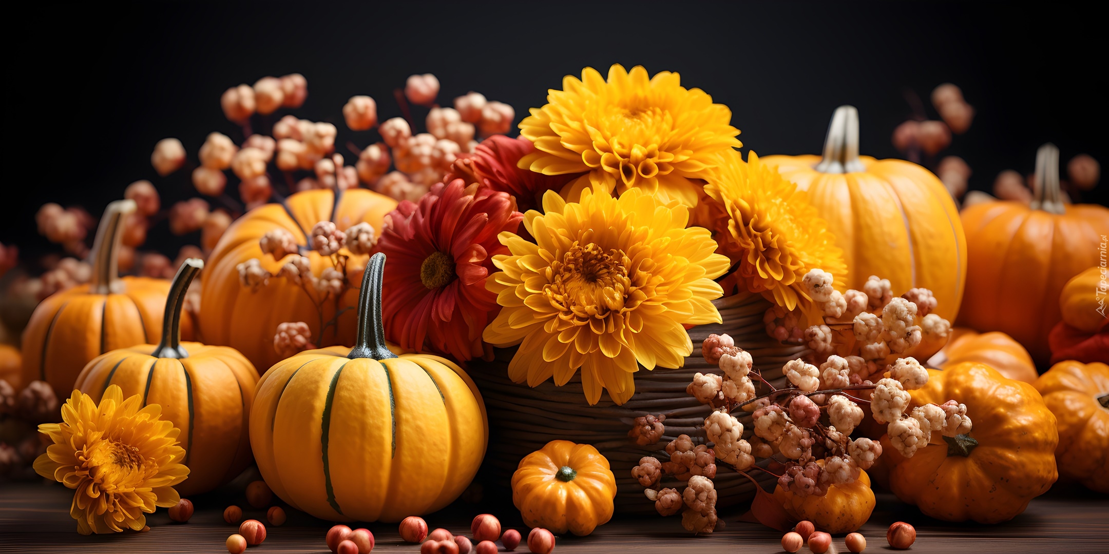 Edytor tapety: Jesienna kompozycja z dyni i kwiatów w grafice