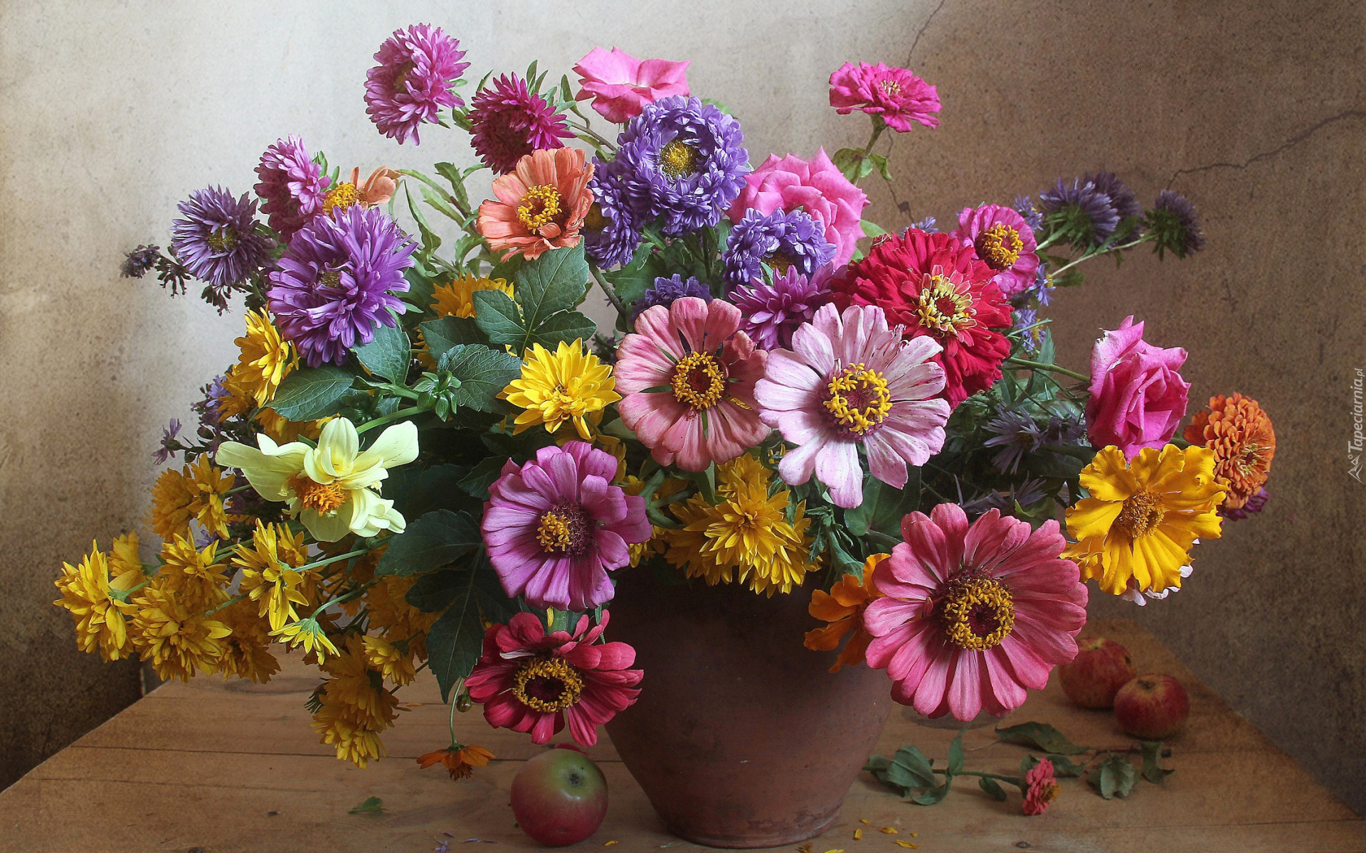 Edytor tapety: Kolorowy bukiet w glinianym wazonie