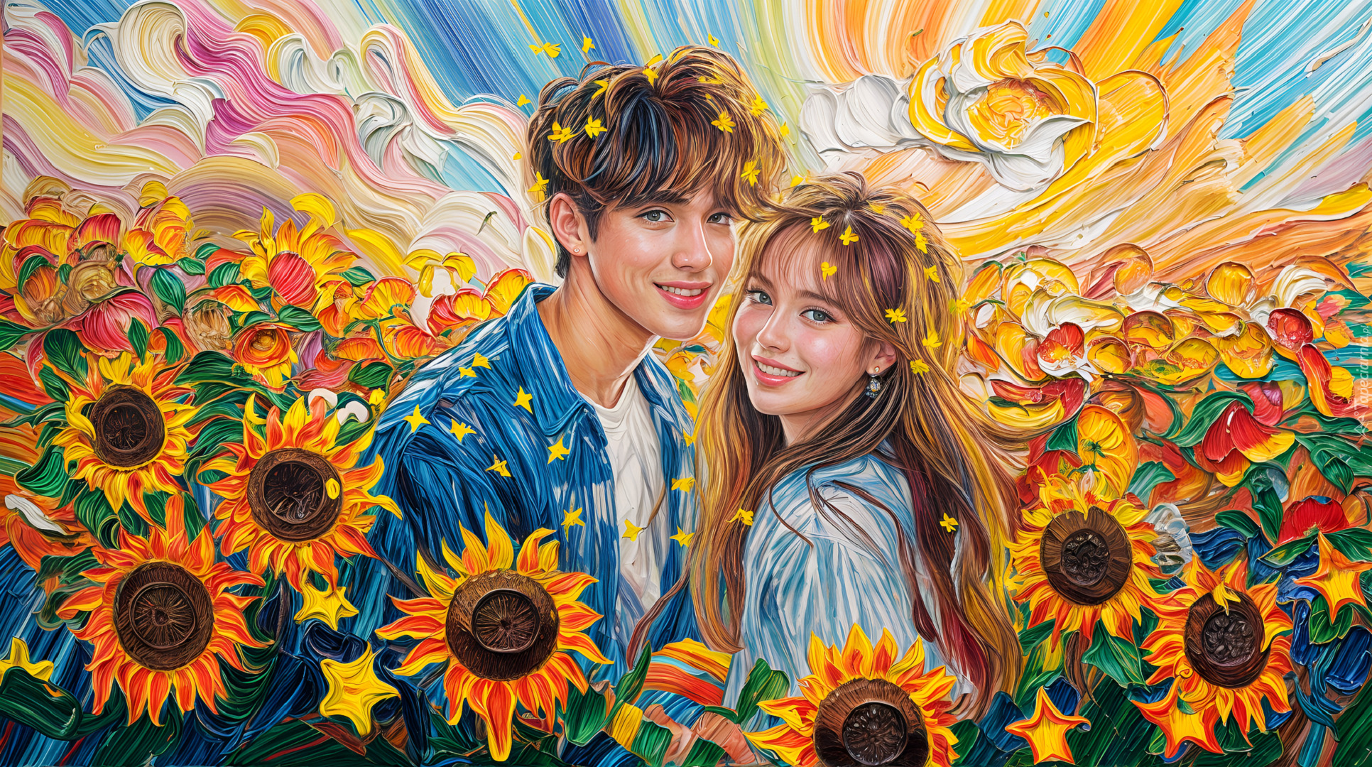 Edytor tapety: Chłopak i dziewczyna na polu słoneczników w grafice