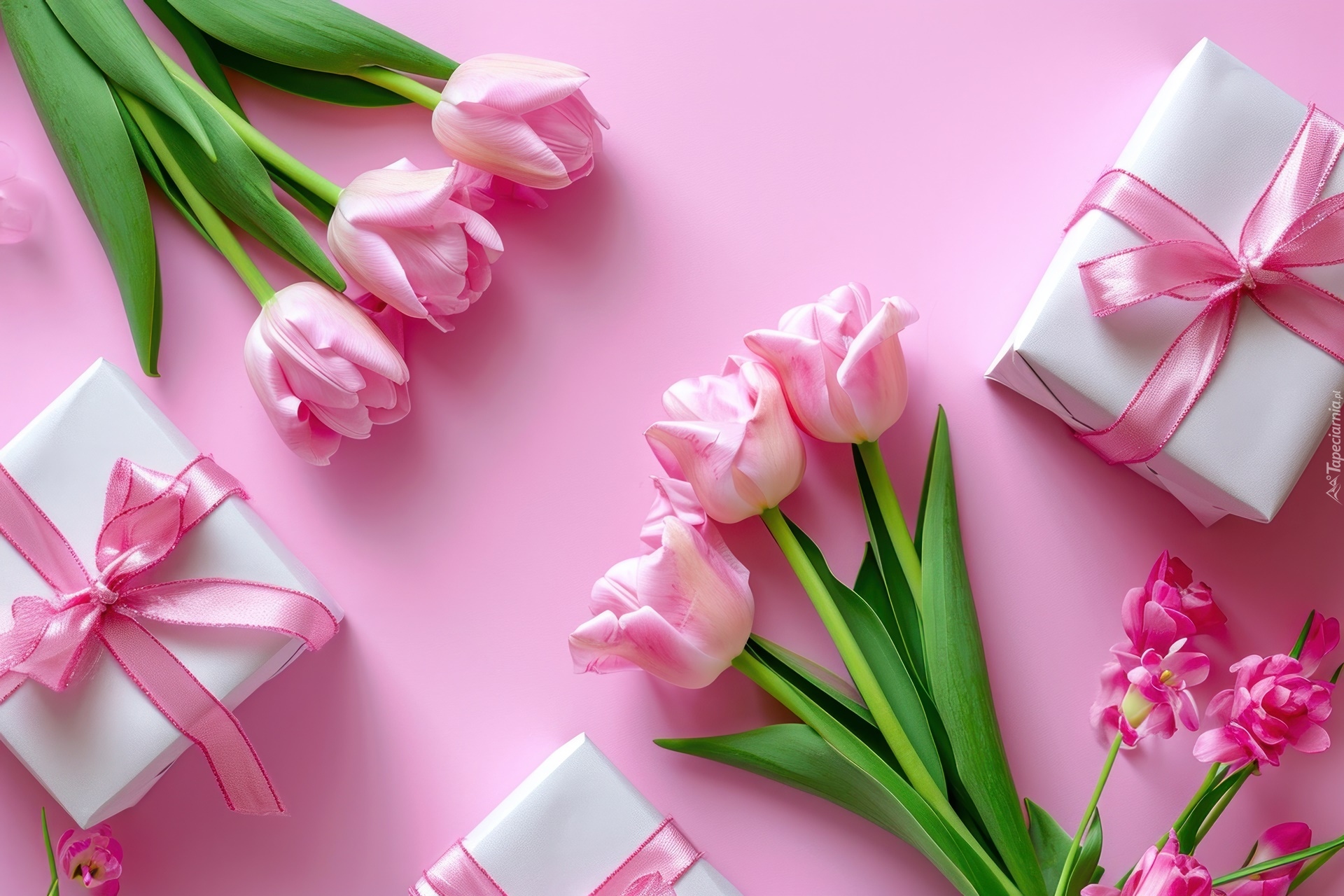 Edytor tapety: Prezenty z kokardami i tulipany na różowym tle