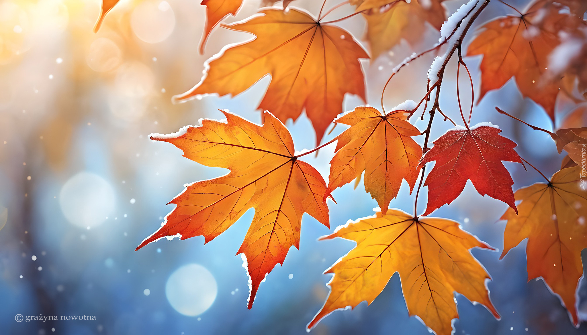 Edytor tapety: Ośnieżona gałązka z liśćmi klonu w grafice