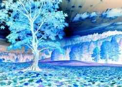 Edytor tapety: Opadłe liście pod drzewem na polanie i jesienny las w promieniach zachodzącego słońca