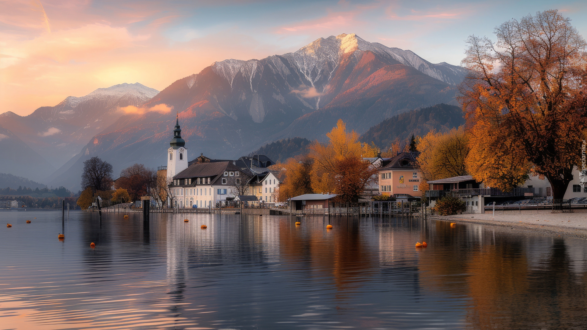 Edytor tapety: Kościół i domy nad jeziorem na tle gór