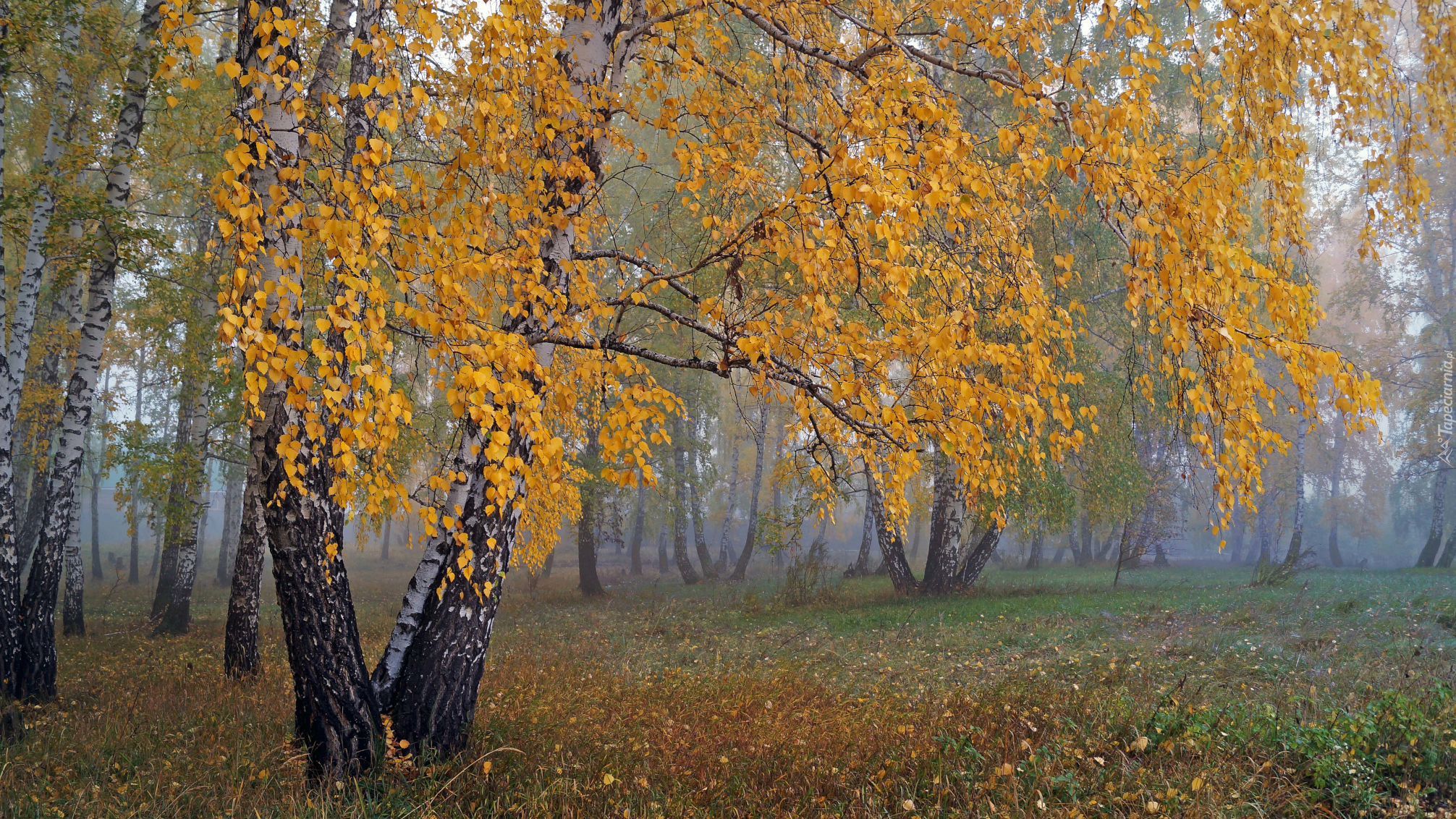 Edytor tapety: Pożółkłe brzozy w zamglonym lesie