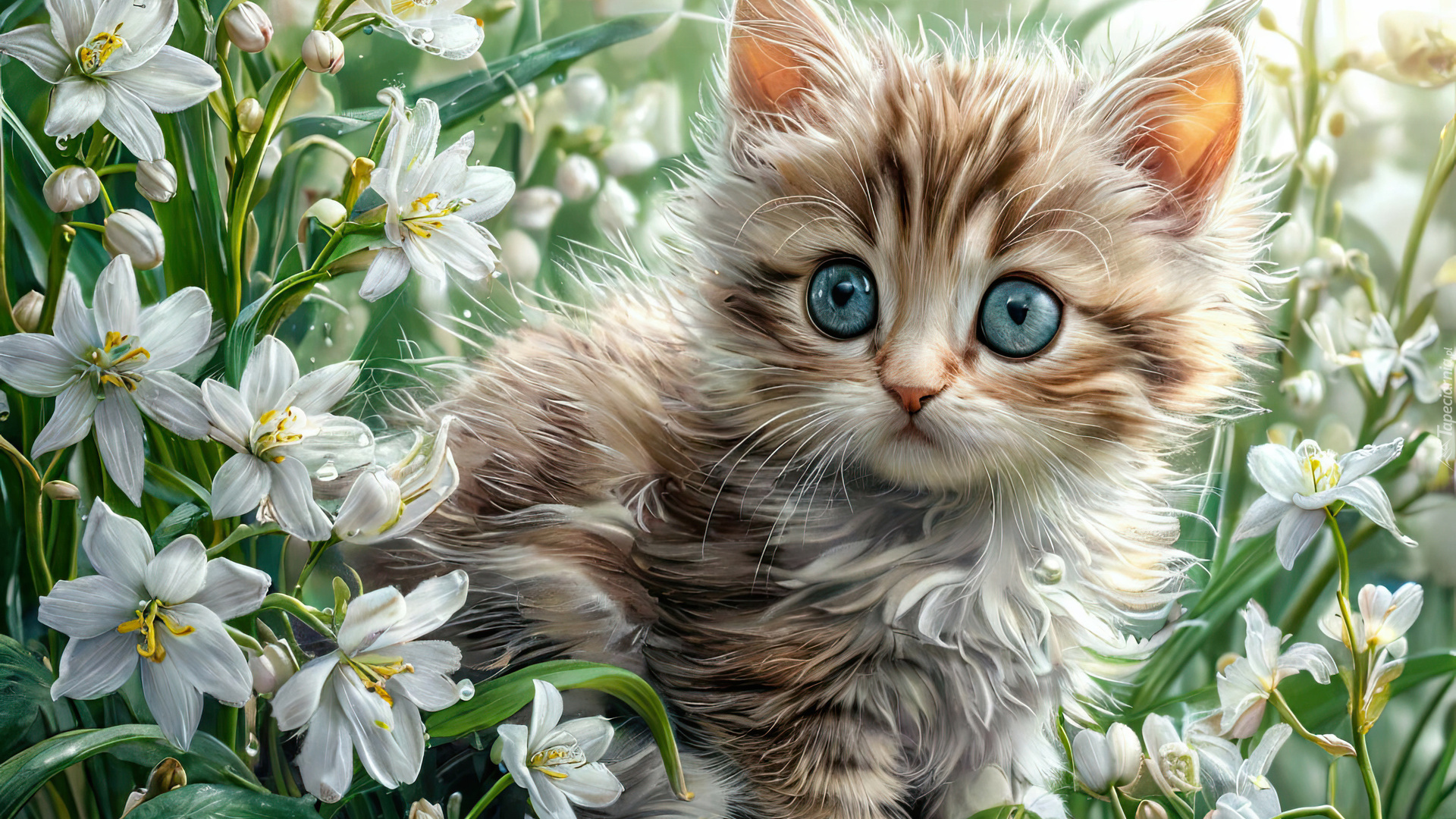 Edytor tapety: Mały kotek wśród białych kwiatów