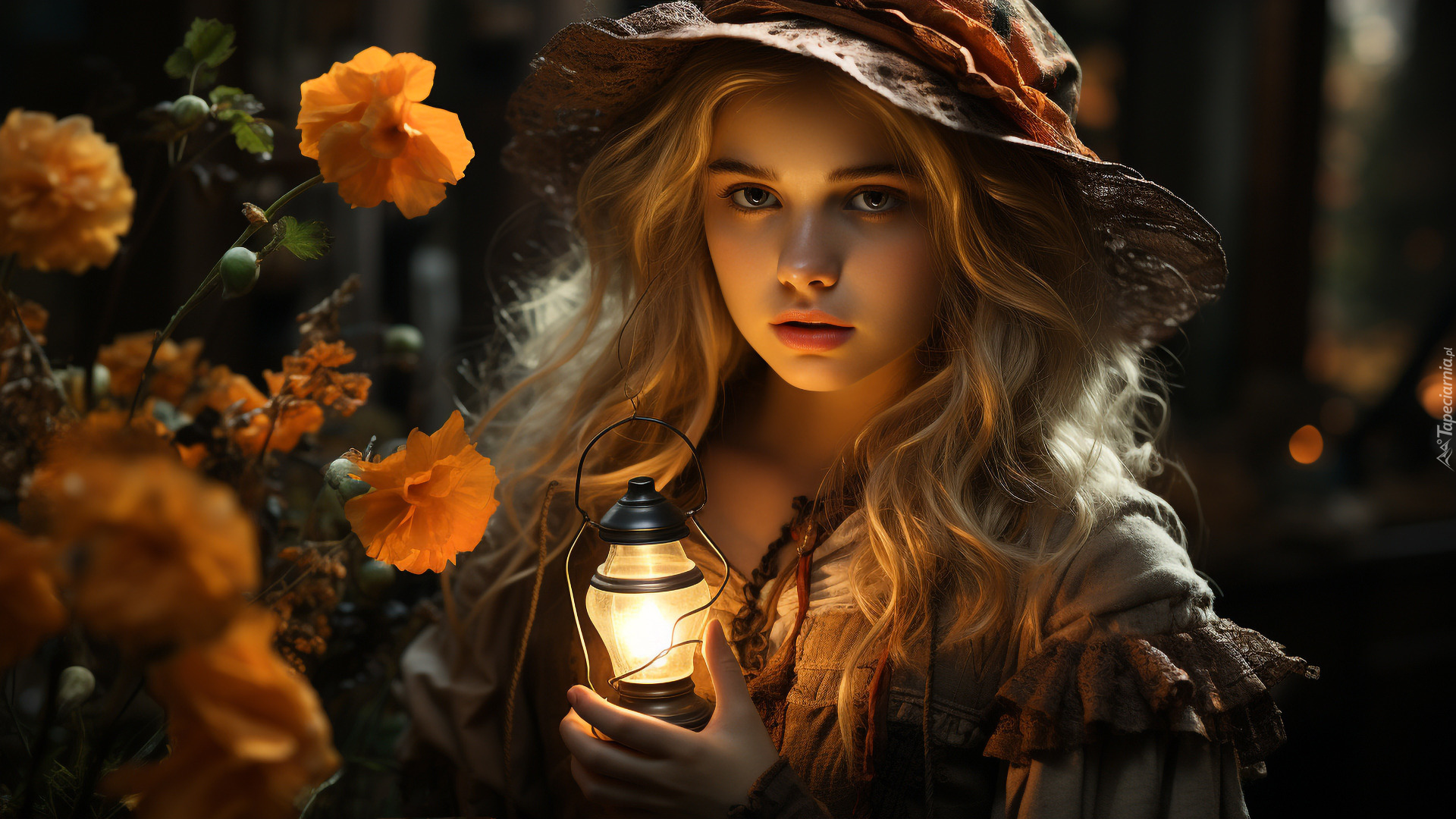 Edytor tapety: Dziewczynka w kapeluszu z zapalonym lampionem w ręce