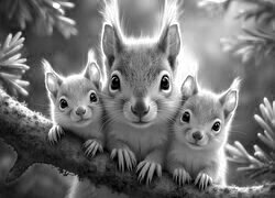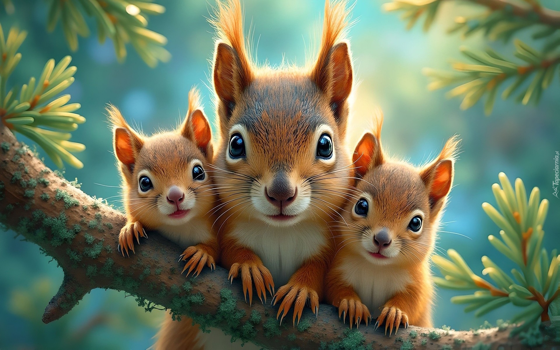 Edytor tapety: Trzy wiewiórki na konarze sosny