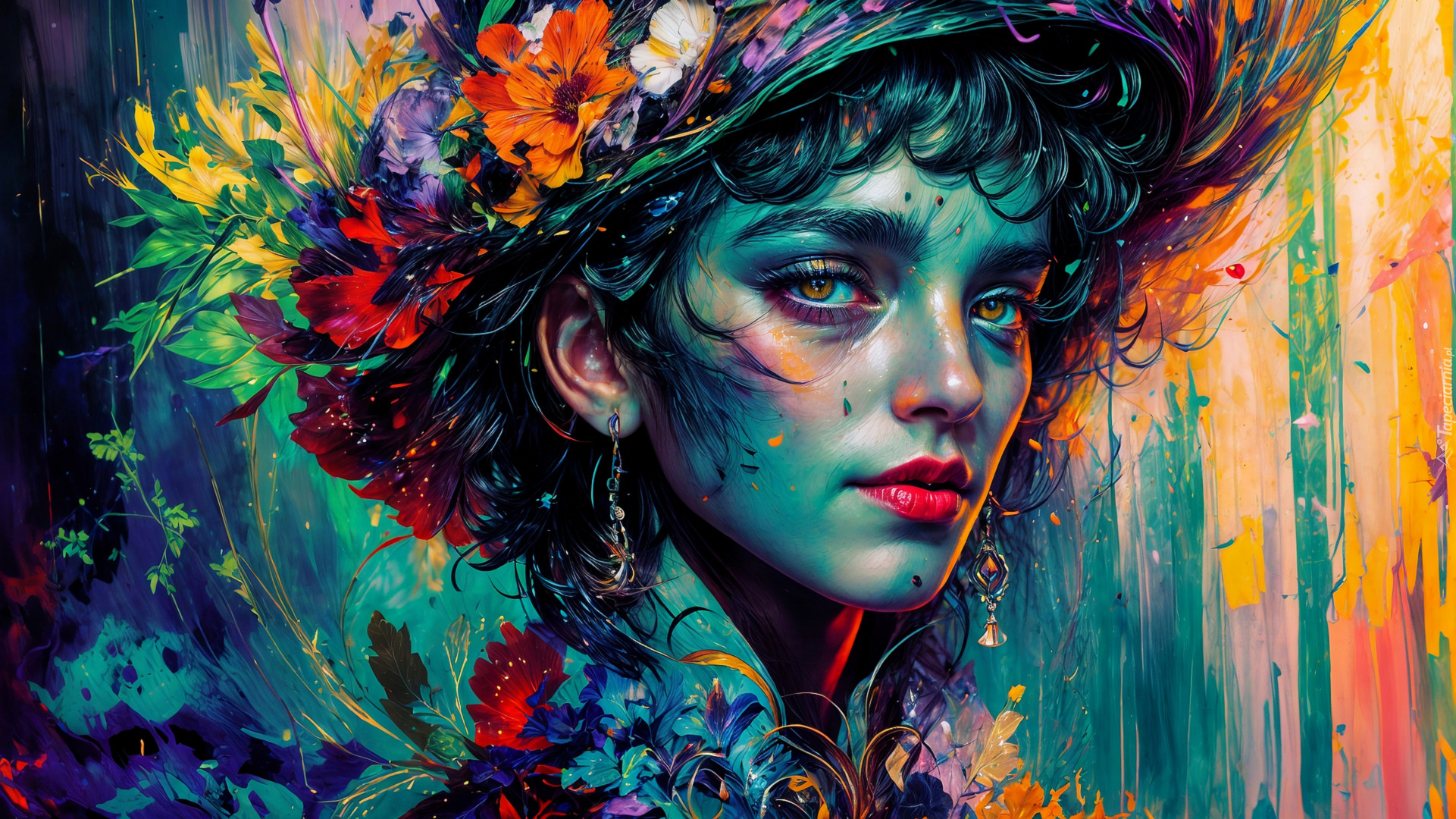 Edytor tapety: Spojrzenie kobiety z kwiatami w kapeluszu