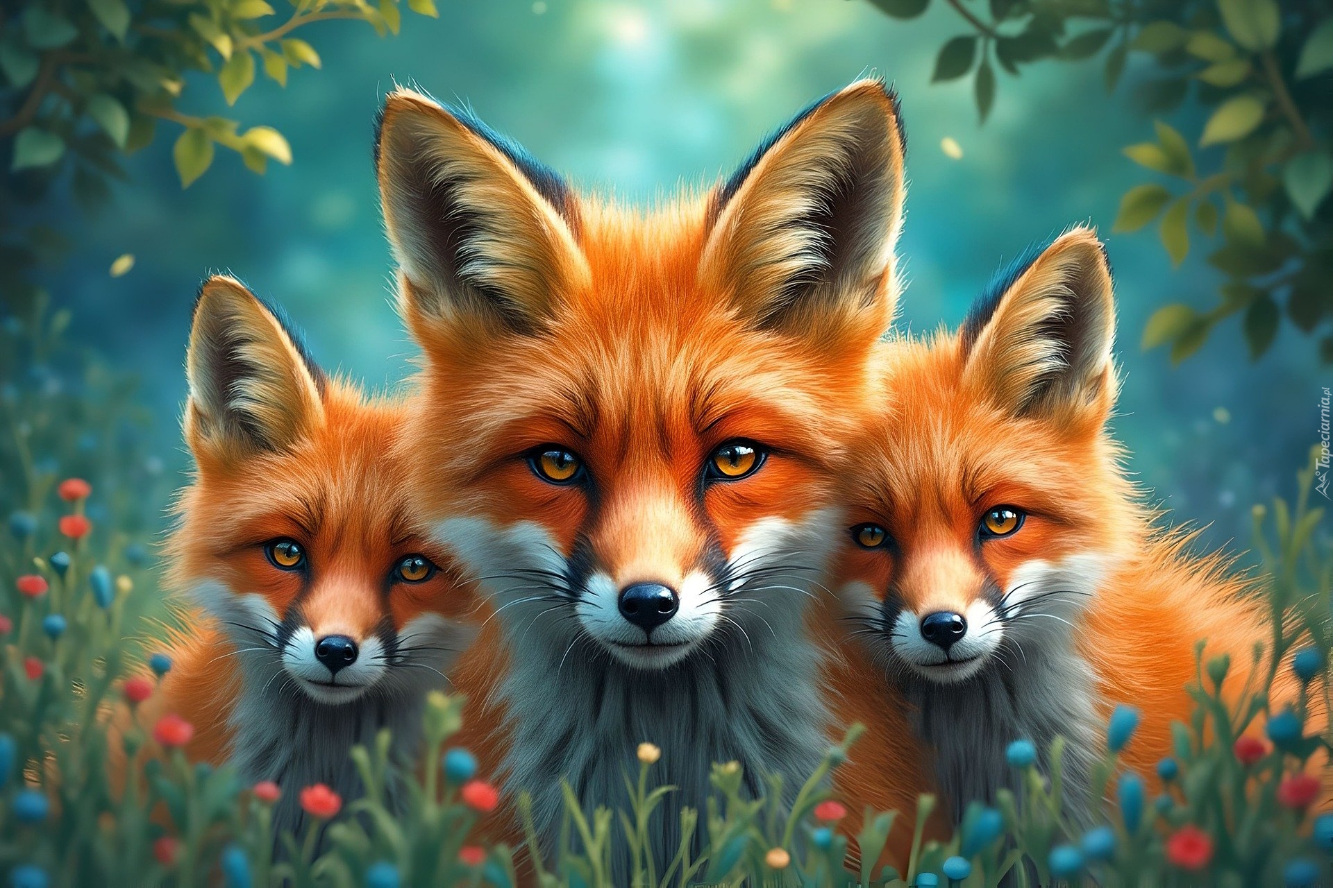 Edytor tapety: Trzy lisy wśród kwiatów w grafice