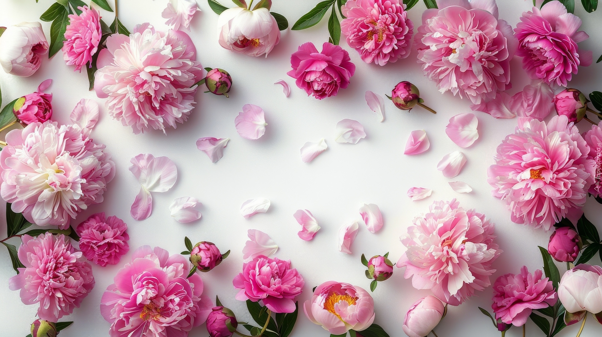 Edytor tapety: Różowe piwonie i płatki na białym tle