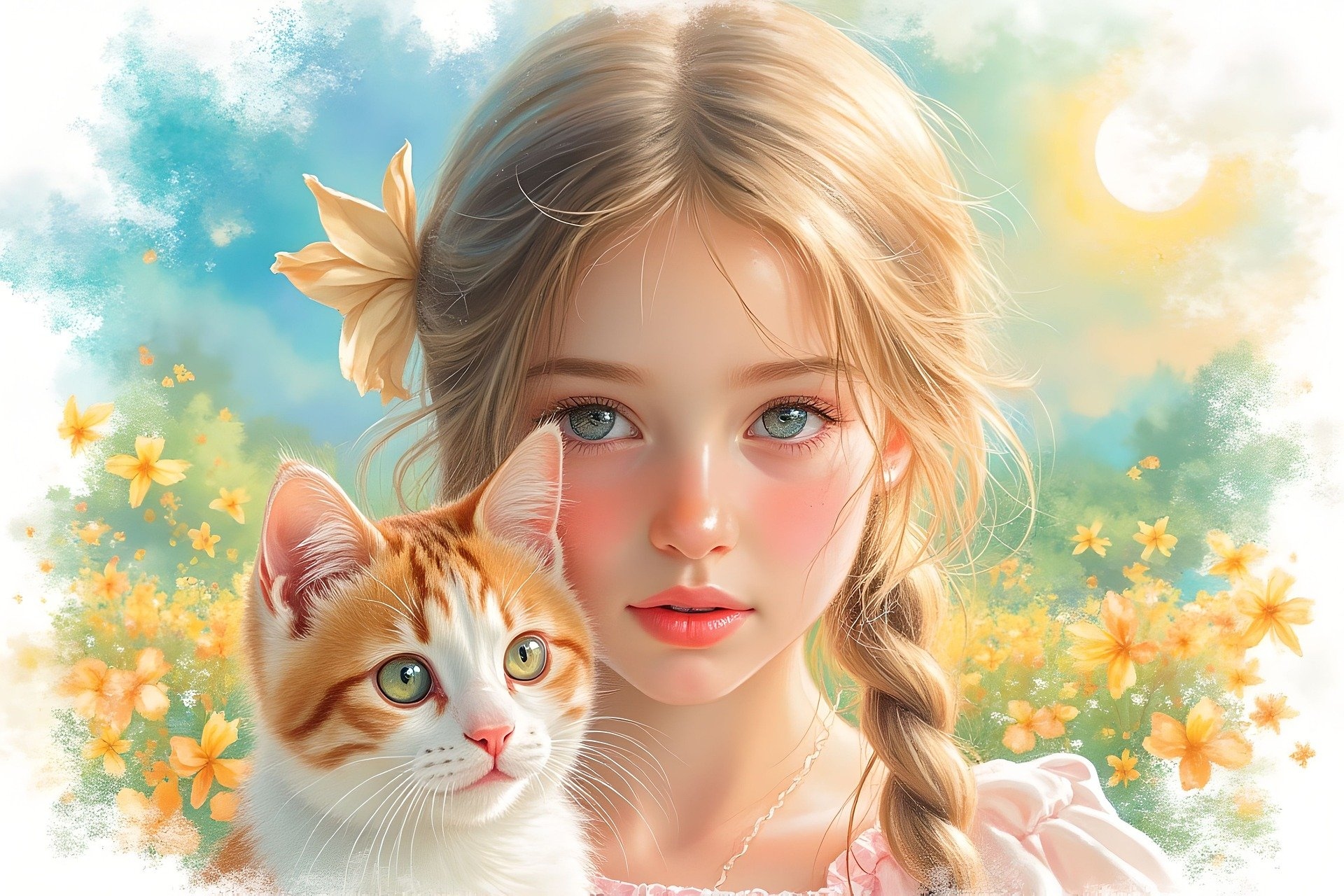 Edytor tapety: Dziewczynka z warkoczem i kotkiem w grafice
