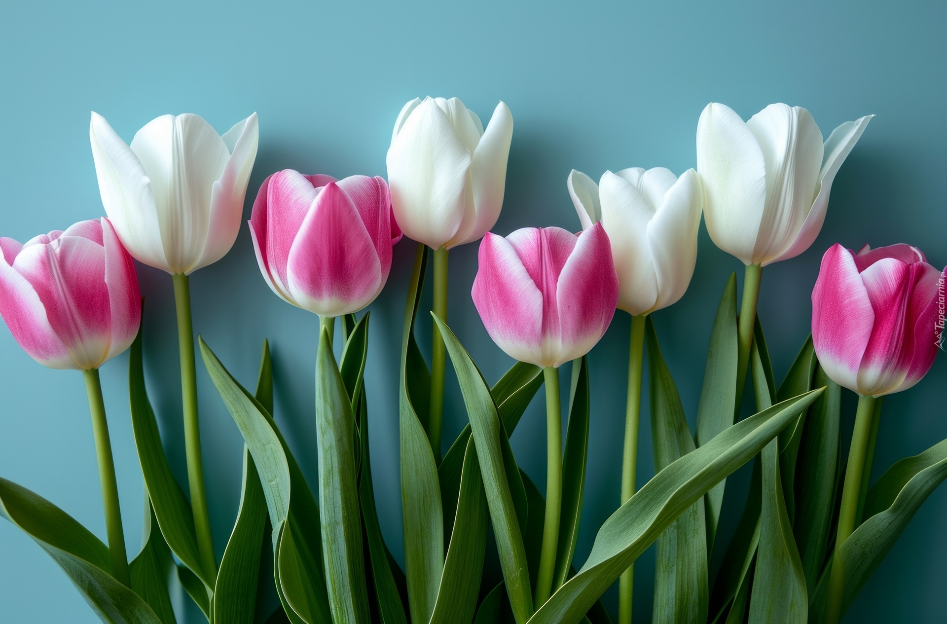 Edytor tapety: Różowe i białe tulipany na niebieskim tle