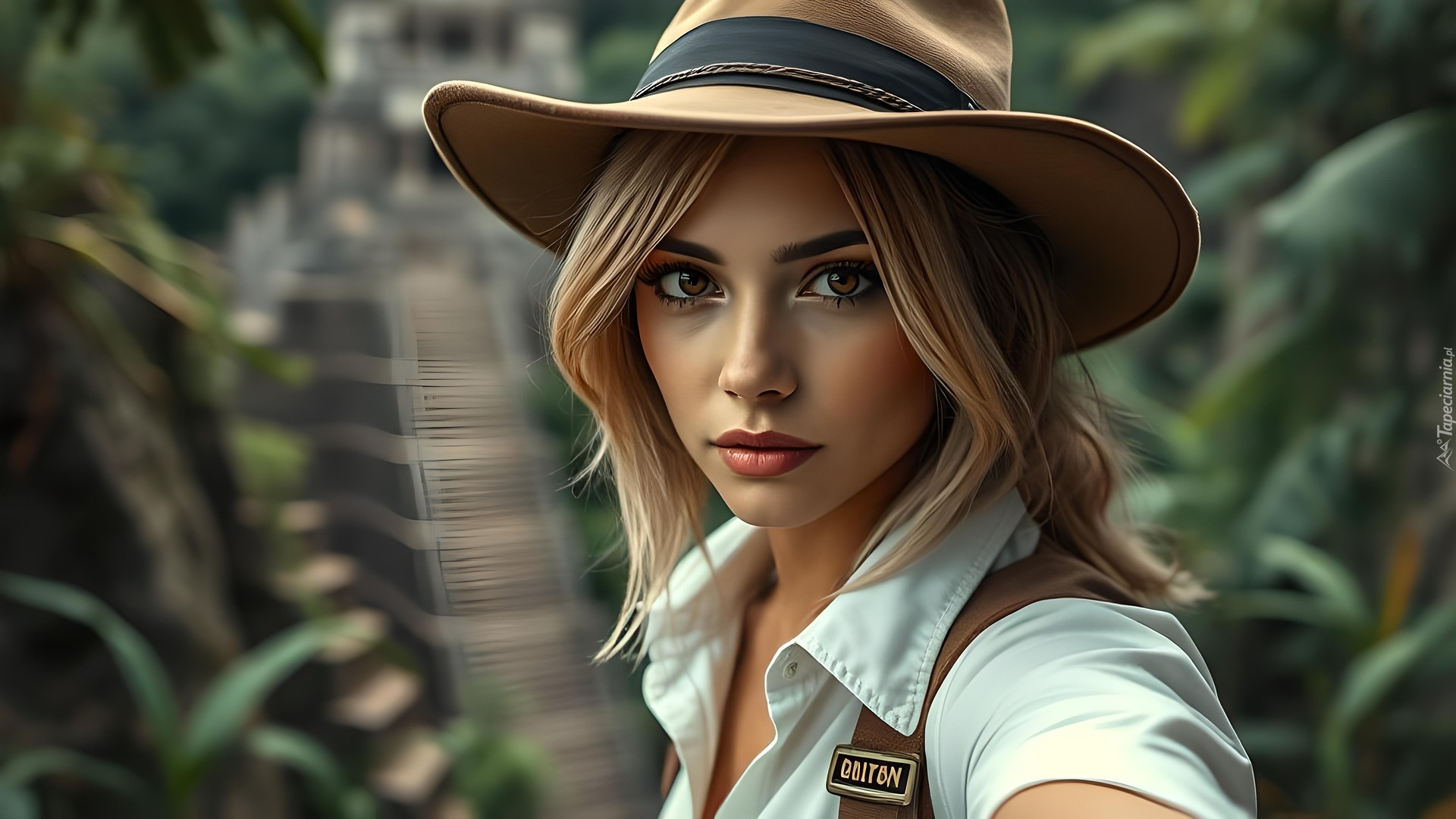 Edytor tapety: Blondynka w kapeluszu i białej bluzce