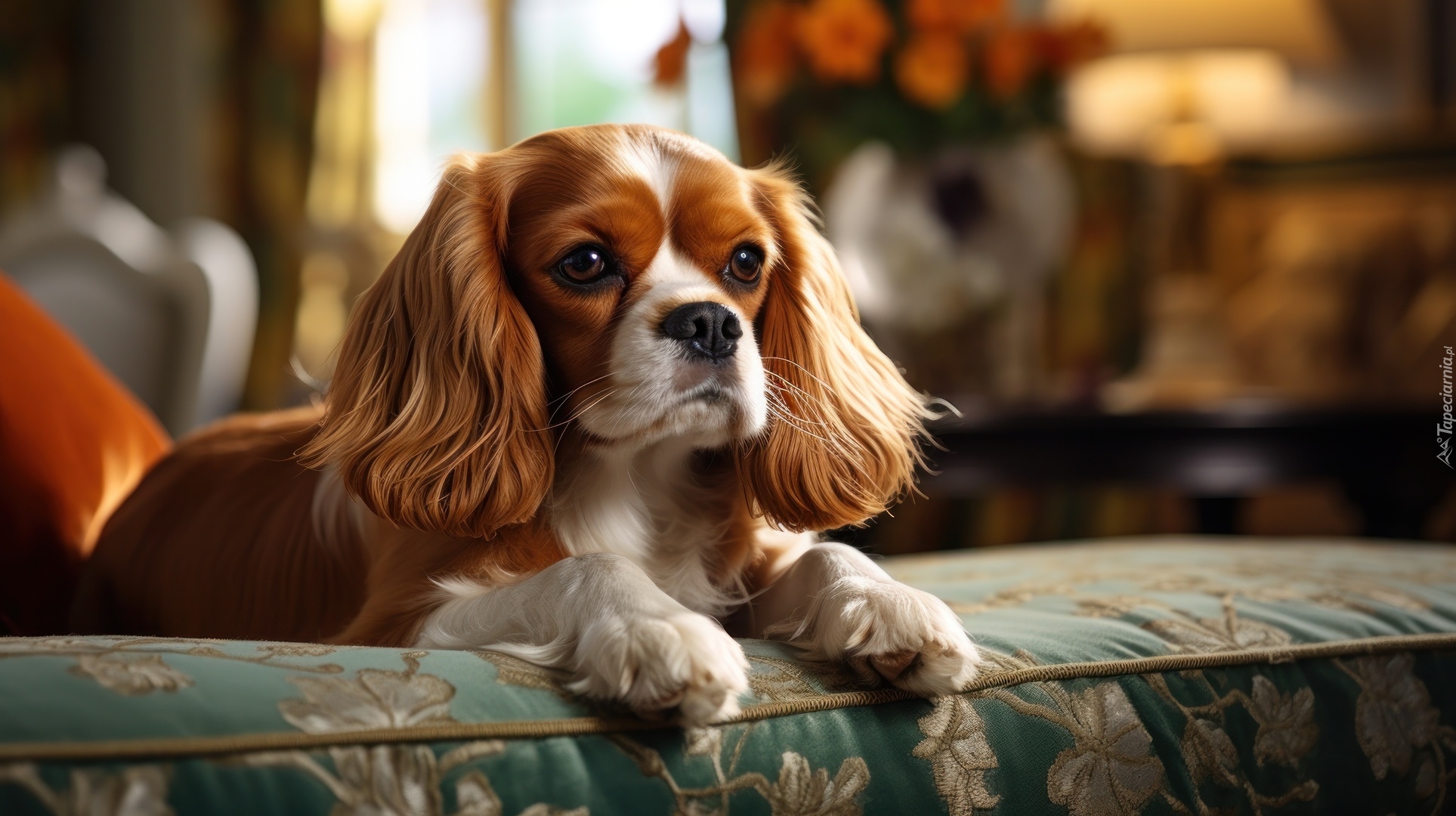 Edytor tapety: Leżący na łóżku Cavalier King Charles spaniel