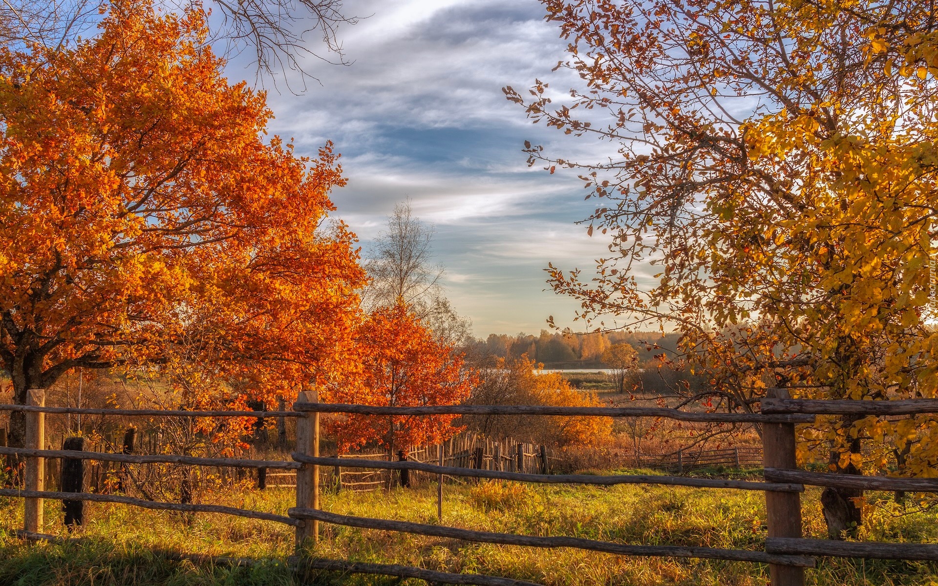 Edytor tapety: Ogrodzenie i pożółkłe drzewa w słonecznym świetle