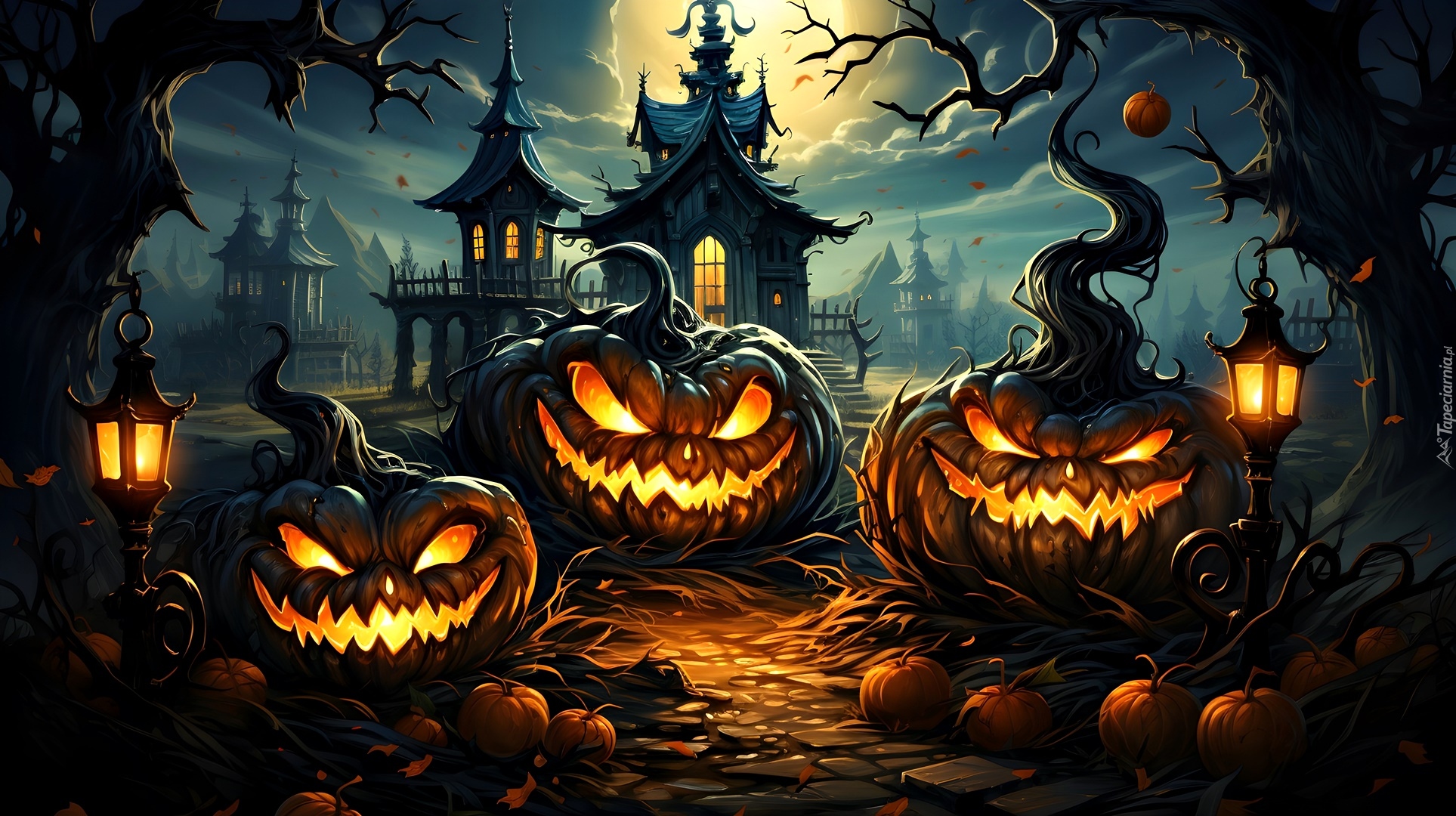 Edytor tapety: Świecące dynie i latarnie na tle domów nocą