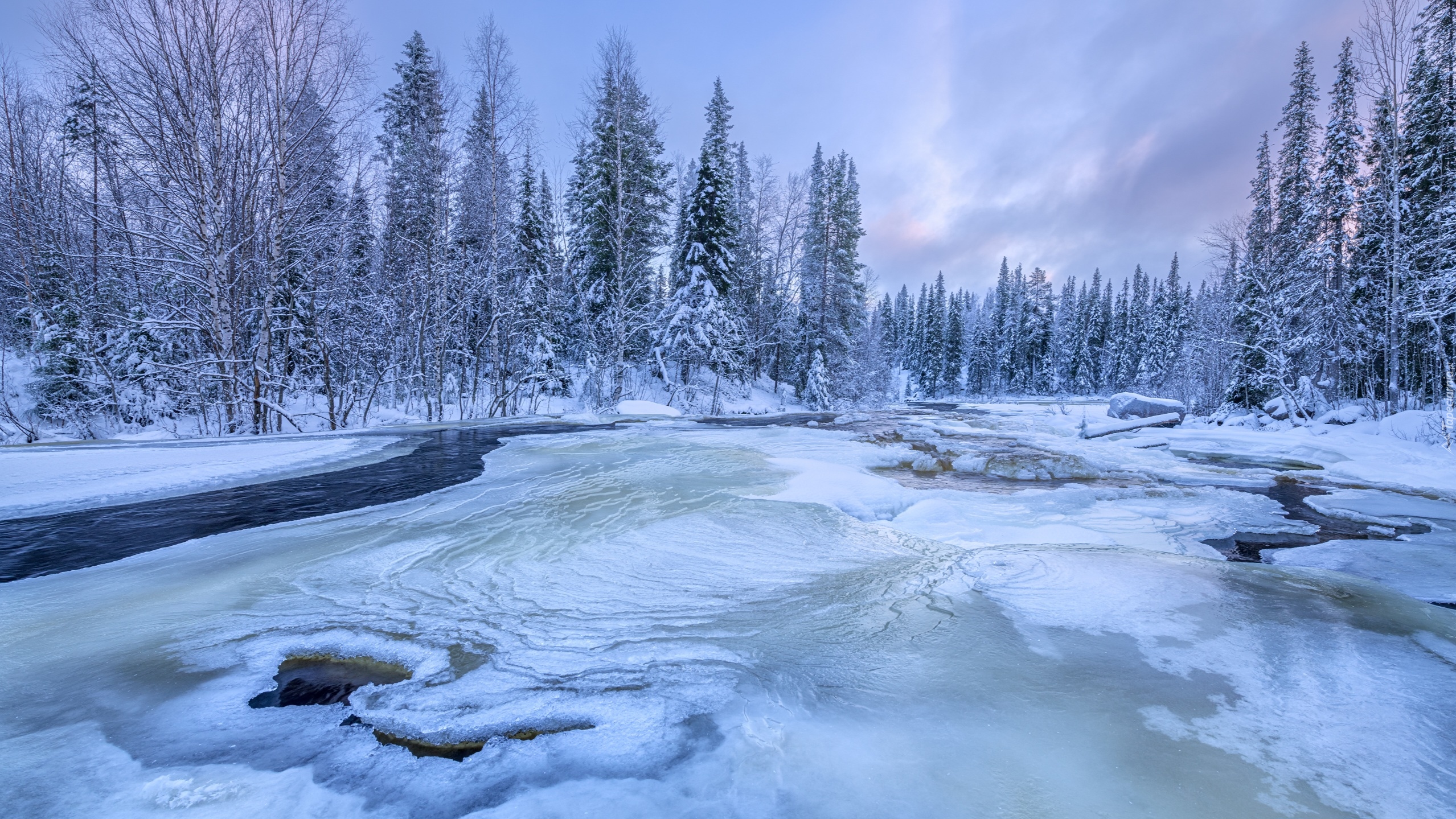 Edytor tapety: Pochmurne niebo nad zamarzniętą rzeką i ośnieżonymi drzewami