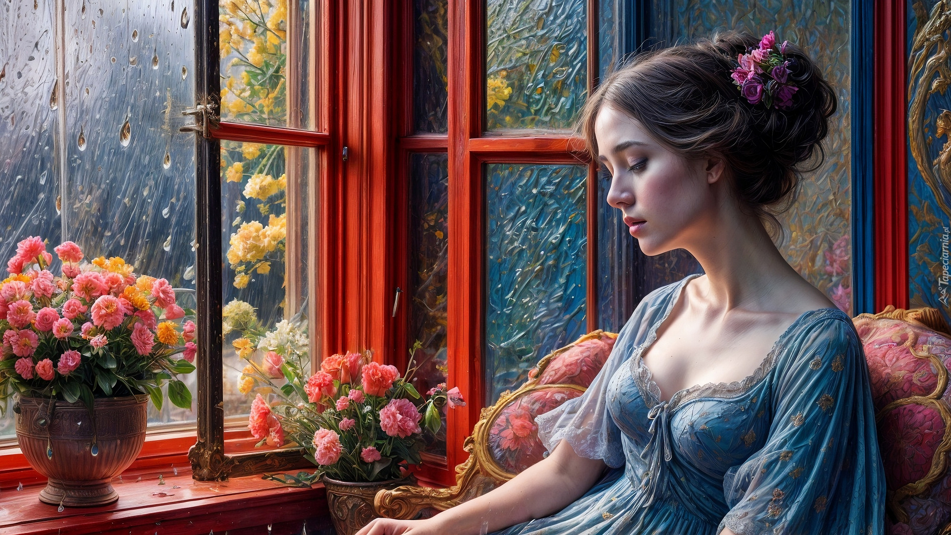 Edytor tapety: Smutna kobieta przy oknie z mokrą szybą