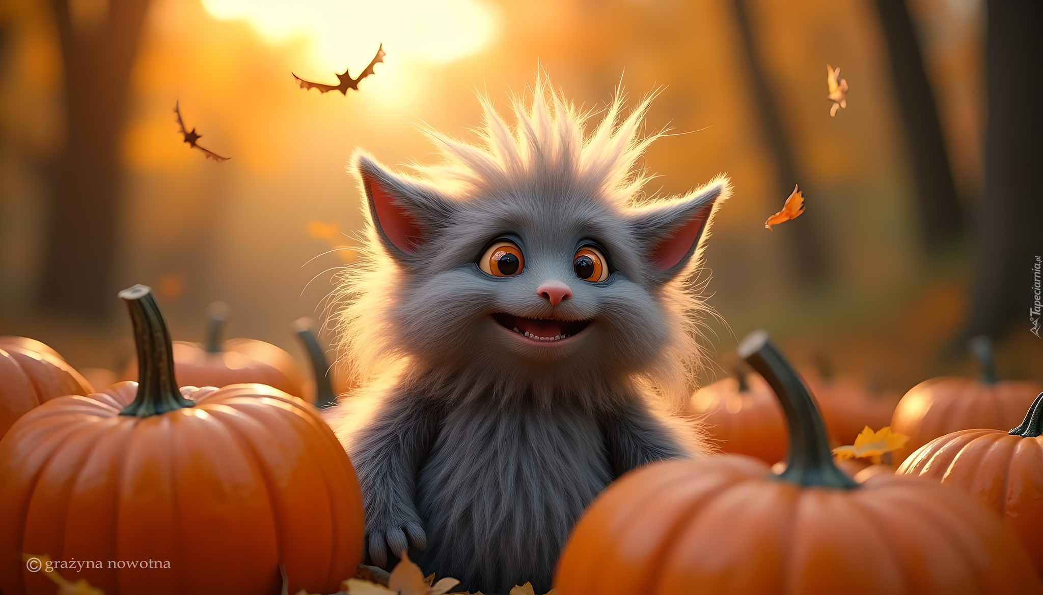 Edytor tapety: Włochaty stworek między dyniami w grafice