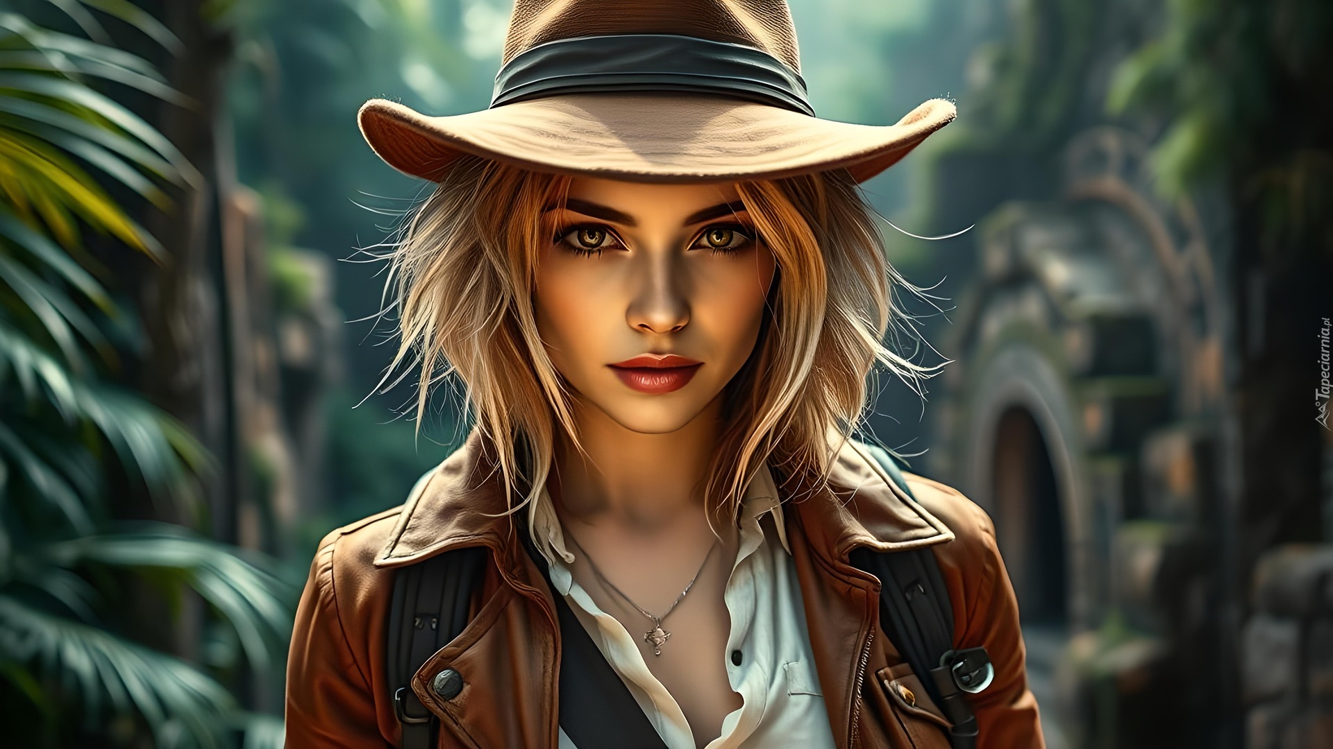 Edytor tapety: Kobieta w skórzanej kurtce i kapeluszu w grafice