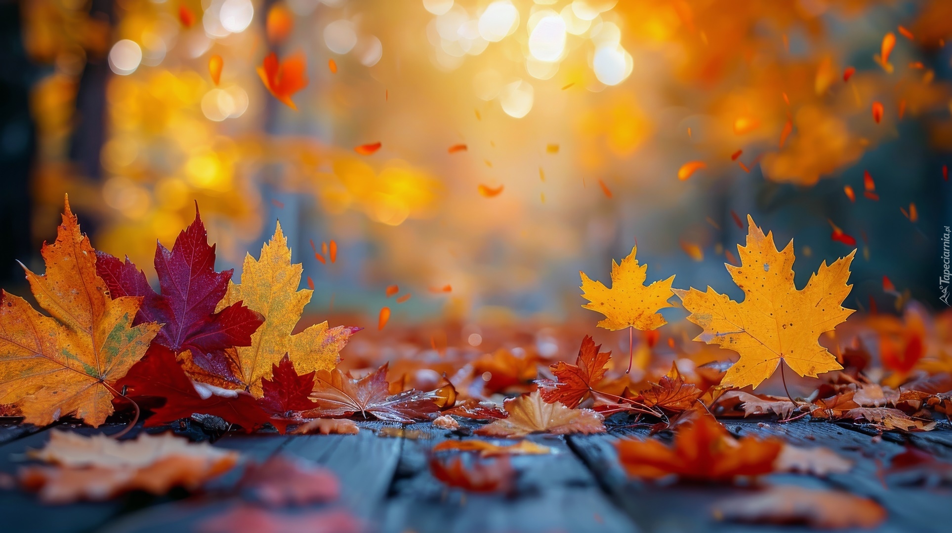 Edytor tapety: Kolorowe jesienne liście klonu na deskach w grafice