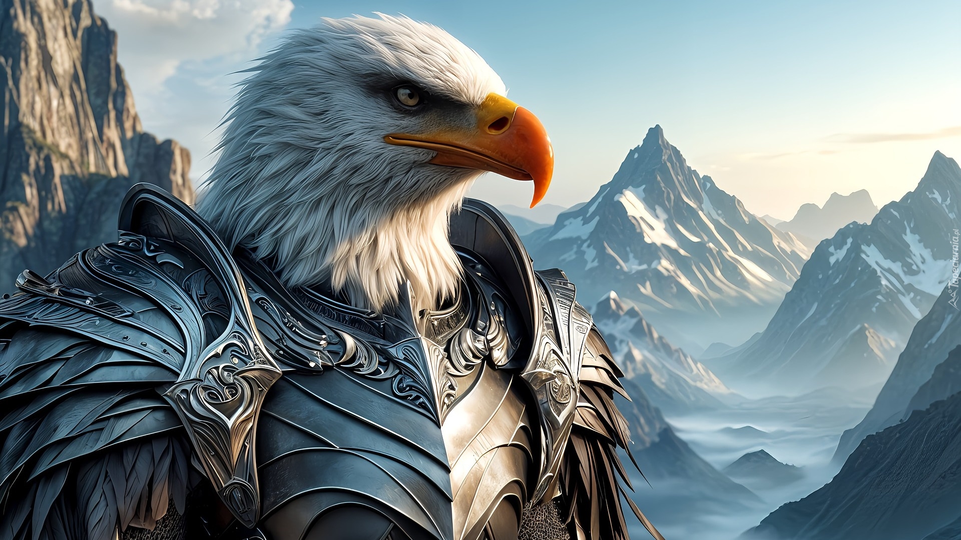 Edytor tapety: Orzeł w zbroi na tle gór w grafice