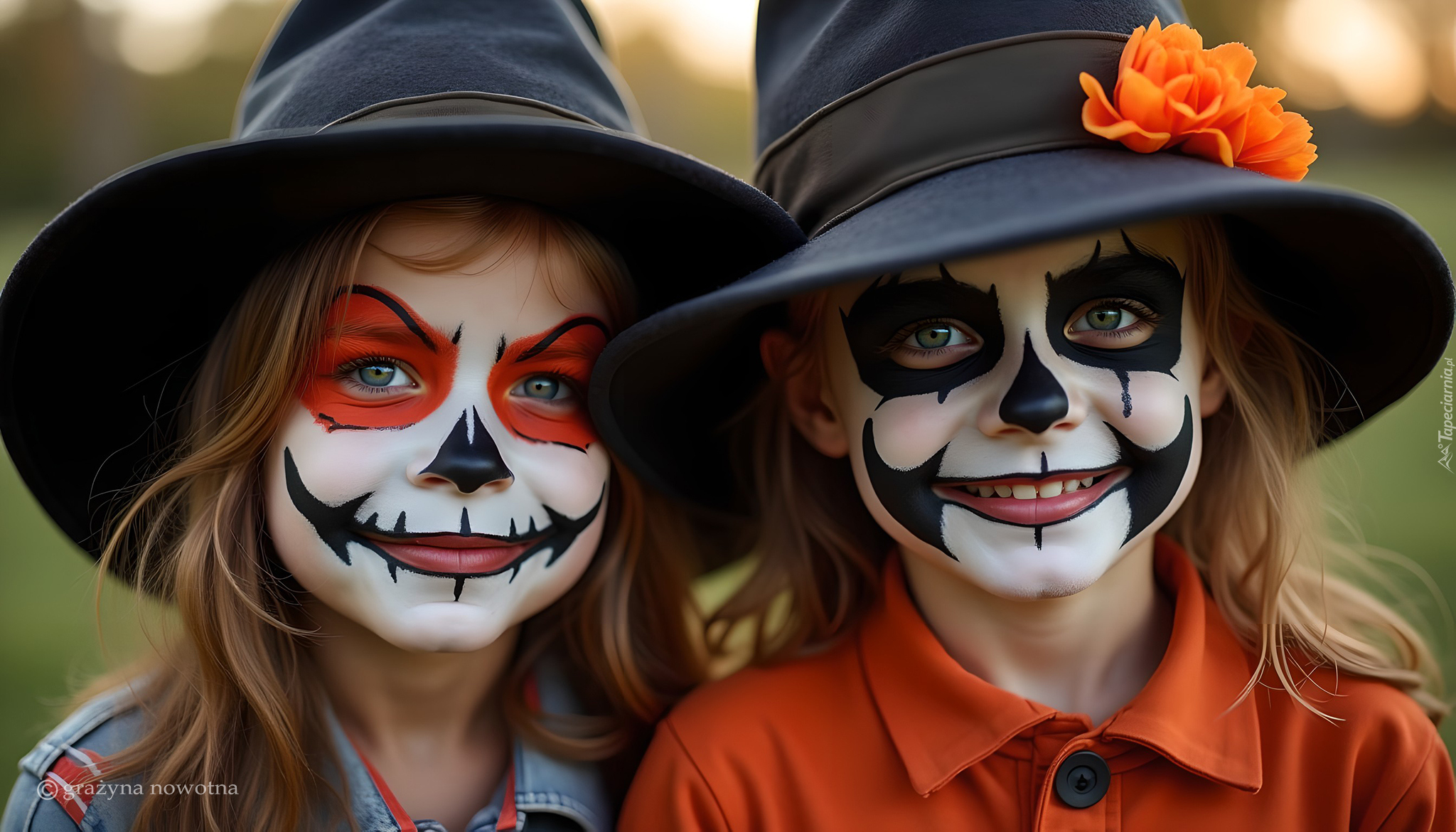 Edytor tapety: Pomalowane na Halloween twarze dwóch dziewczynek w kapeluszach