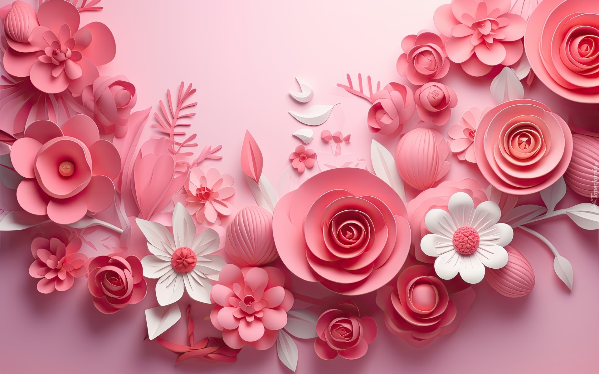 Edytor tapety: Różowe i białe papierowe kwiaty na różowym tle