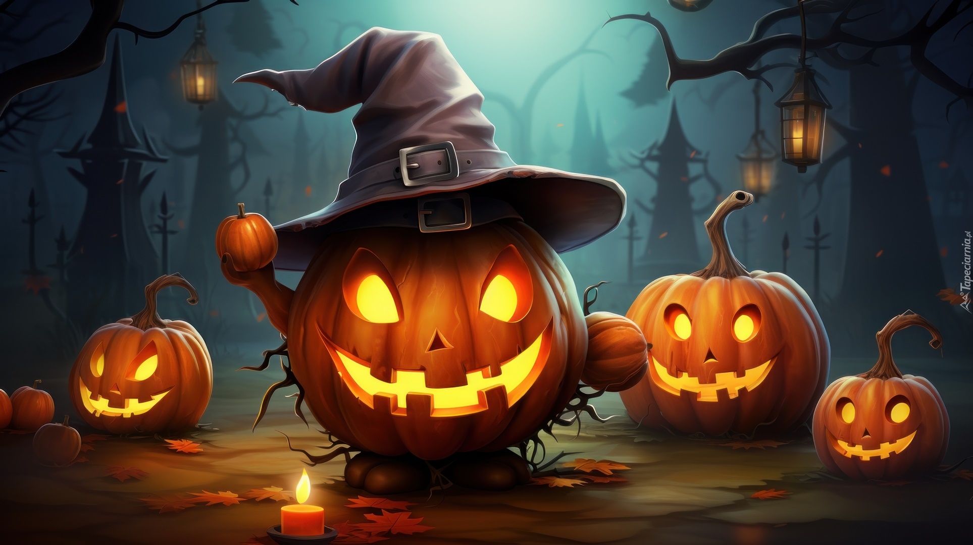 Edytor tapety: Świecąca dynia w kapeluszu na Halloween w grafice