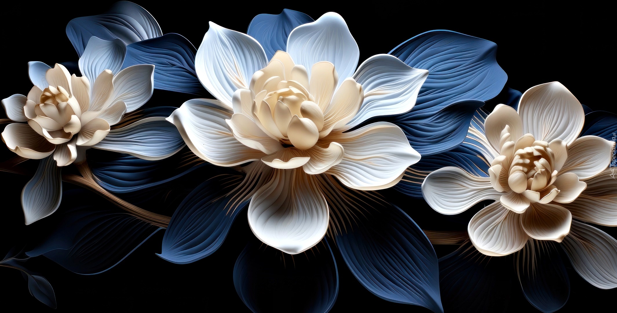 Edytor tapety: Białe kwiaty i niebieskie liście na czarnym tle