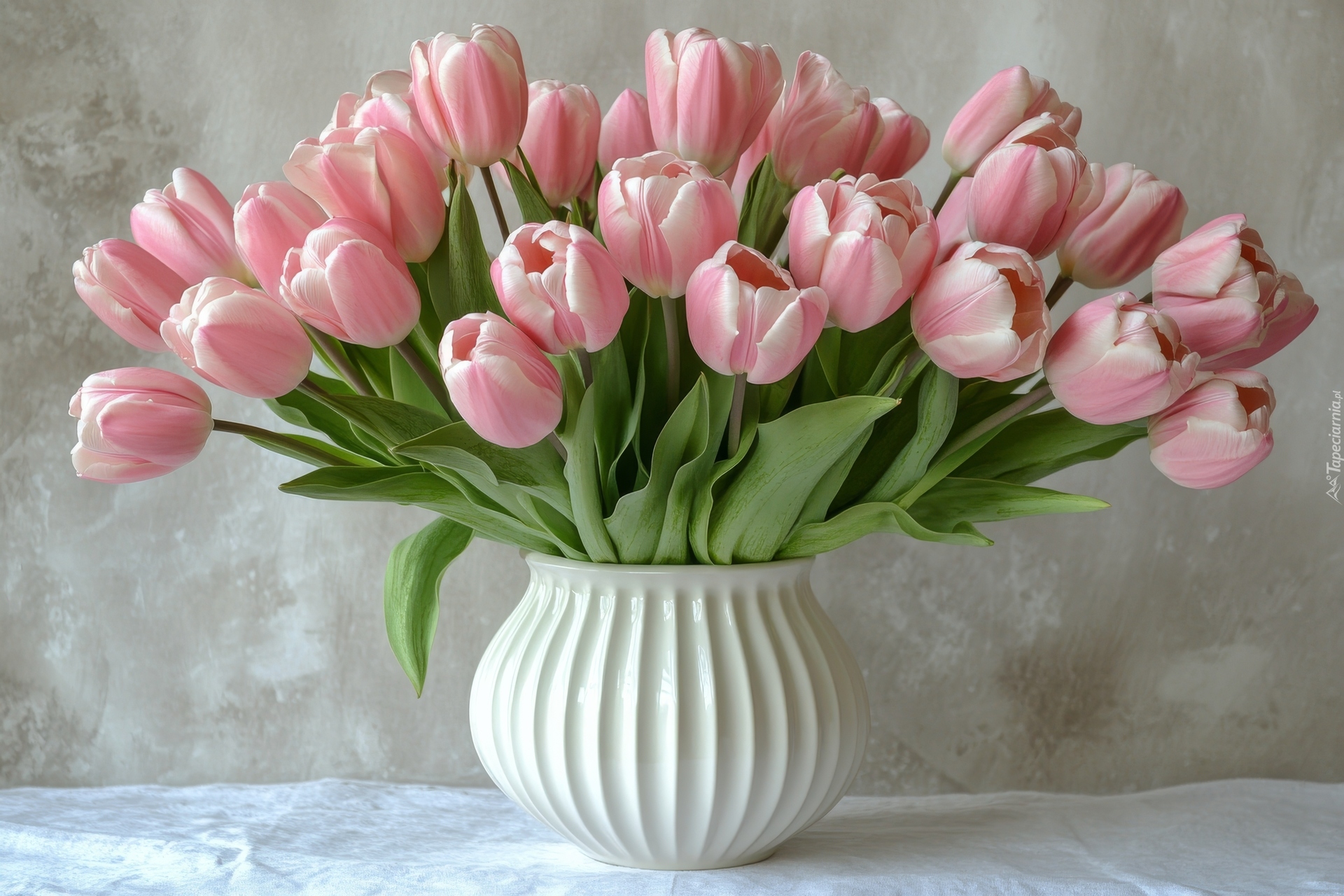 Edytor tapety: Bukiet jasnoróżowych tulipanów w białym wazonie