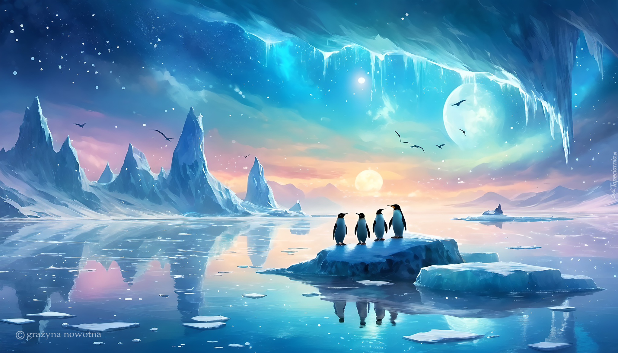 Edytor tapety: Cztery pingwiny na krze lodowej w grafice