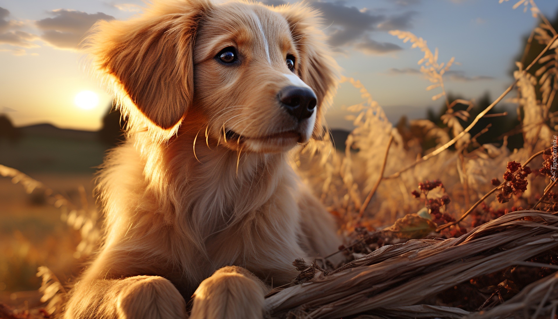 Edytor tapety: Leżący golden retriever z łapami na uschniętej roślinie