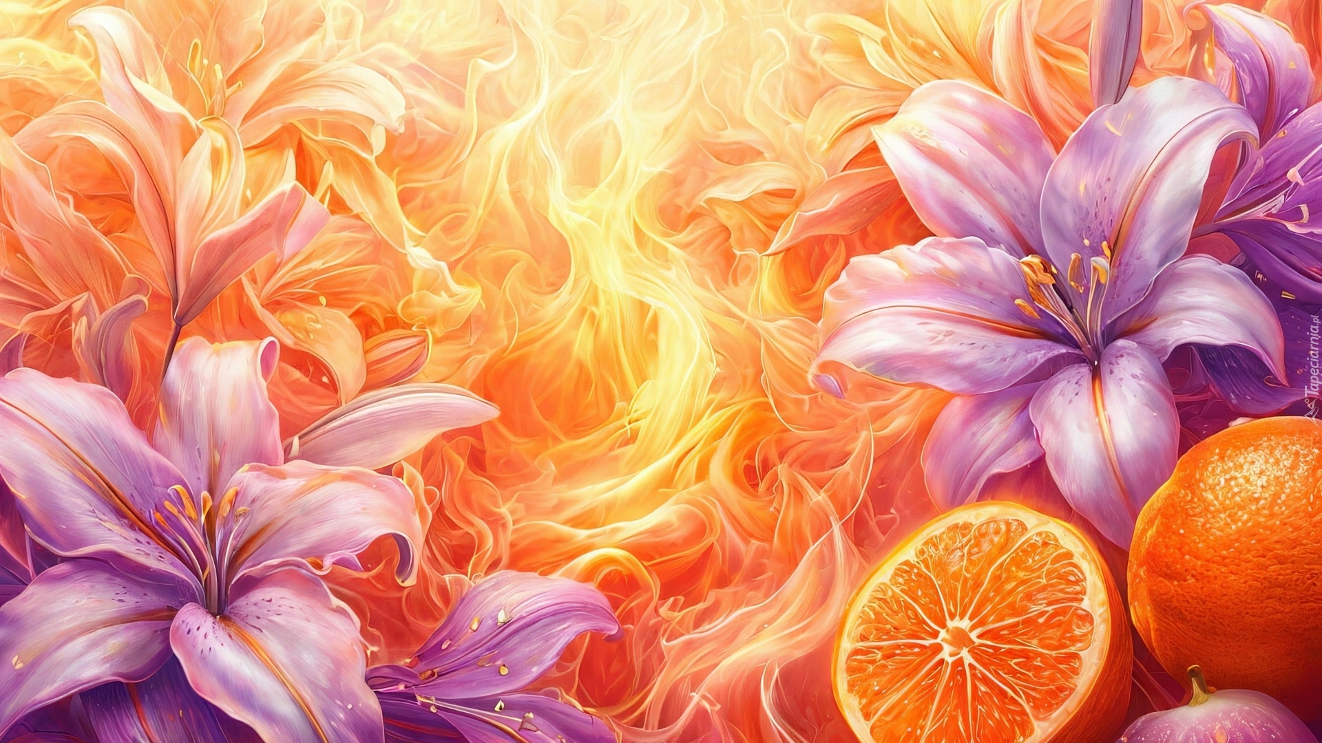 Edytor tapety: Pomarańcze i fioletowe lilie w grafice
