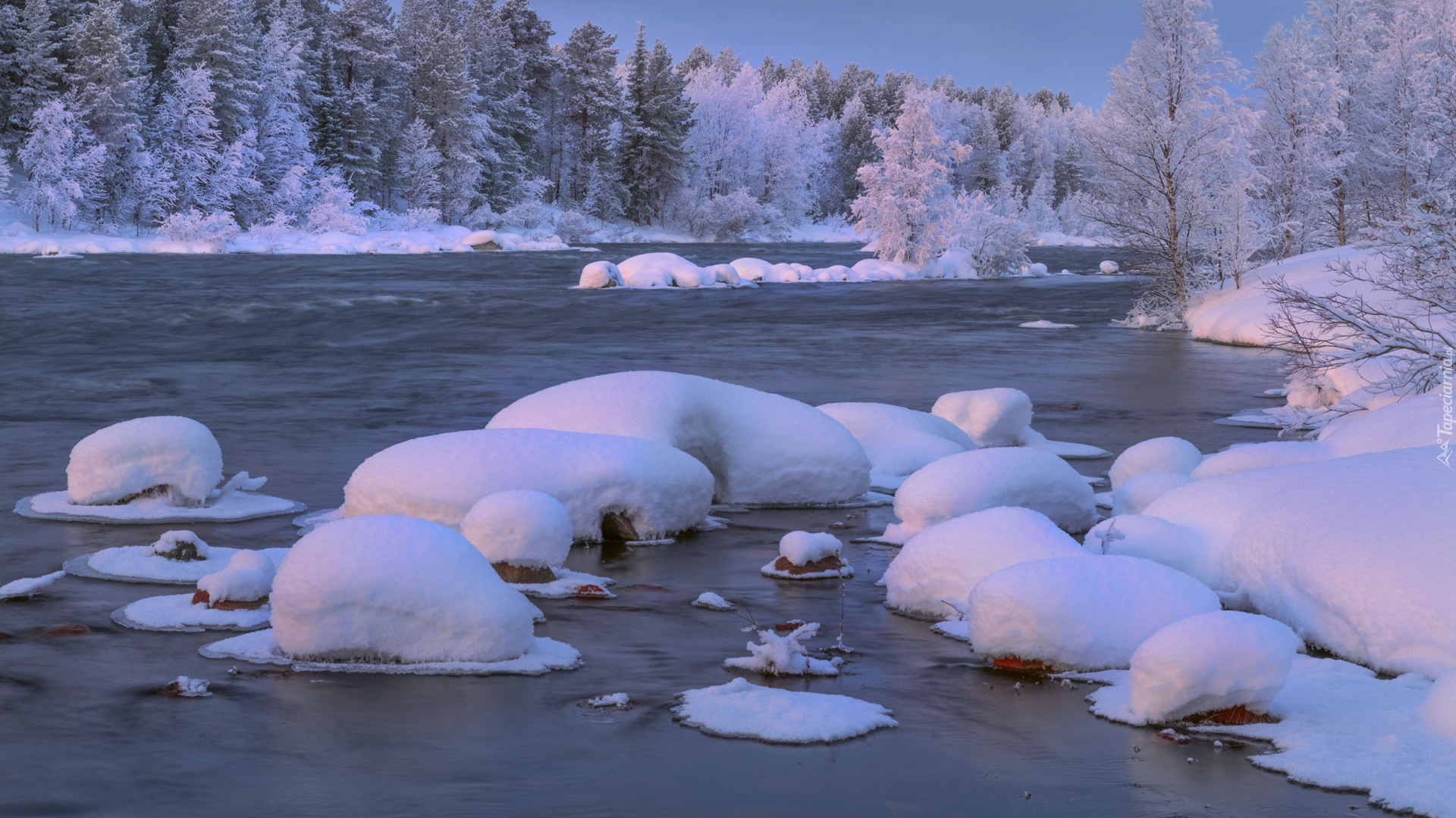 Edytor tapety: Ośnieżone drzewa i śnieg na kamieniach w rzece